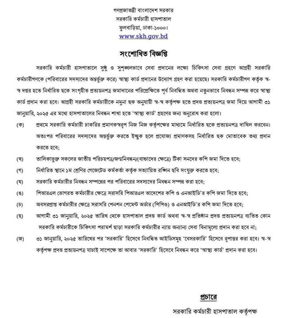 - আগামী ৩১ জানুয়ারি, ২০২৫ তারিখ থেকে হাসপাতাল প্রদত্ত কার্ড অথবা স্ব-স্ব প্রতিষ্ঠান প্রদত্ত প্রত্যয়নপত্র ব্যতিত কোন সরকারি কর্মচারীকে চিকিৎসা পরামর্শ ছাড়া সরকারি কর্মচারীর ন্যায় অন্যান্য সেবা বিনামূল্যে প্রদান করা হবে না;