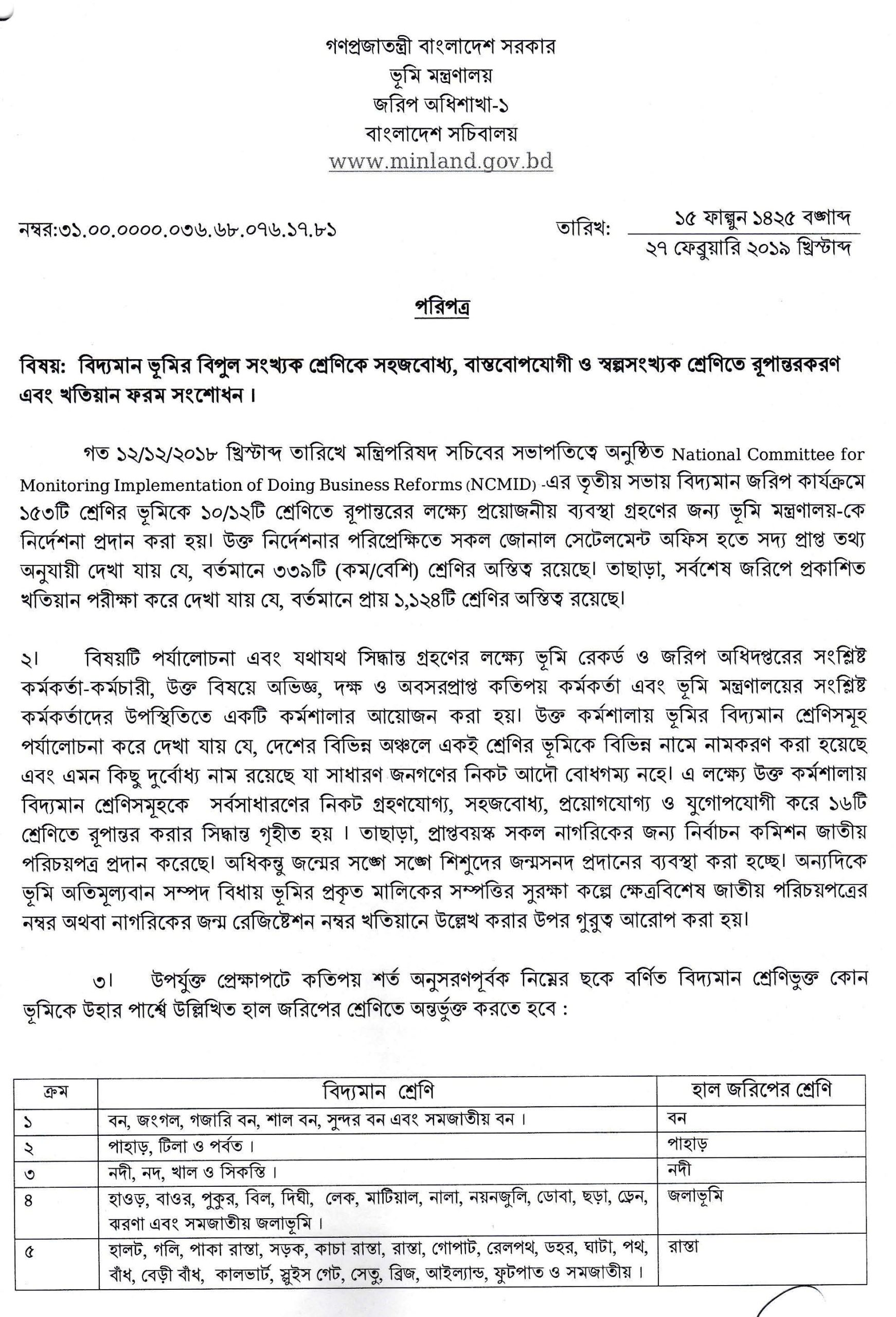 দেশের ভূমি জরিপ কার্যক্রমে দীর্ঘদিনের জটিলতা কমাতে এবং ভূমি ব্যবস্থাপনা সহজ করতে যুগান্তকারী পদক্ষেপ নিয়েছে ভূমি মন্ত্রণালয় । বিপুল সংখ্যক দুর্বোধ্য ও অবাস্তব ভূমির শ্রেণিকে সহজবোধ্য ১৬টি শ্রেণিতে রূপান্তর করে একটি পরিপত্র জারি করা হয়েছে । এই পরিবর্তনের পাশাপাশি জমির মালিকদের সুরক্ষার জন্য সংশোধিত খতিয়ান ফরমে জাতীয় পরিচয়পত্র (NID) বা জন্ম নিবন্ধন নম্বর যুক্ত করার নির্দেশনা দেওয়া হয়েছে ।