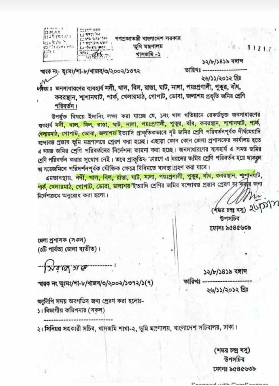 জনস্বার্থে ব্যবহৃত ভূমি চিরস্থায়ীভাবে সংরক্ষিত ২০২৫ । নদী-খাল, পার্ক-মাঠের শ্রেণি পরিবর্তন বা বন্দোবস্ত দেওয়া যাবে না—সরকারি নির্দেশ?