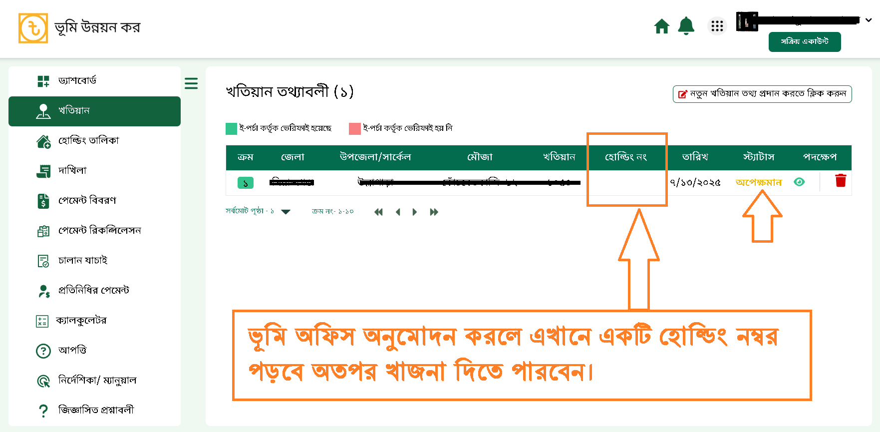 জমির নামজারি হওয়ার পর অথবা উত্তরাধিকার সূত্রে প্রাপ্ত জমির খাজনা দিতে ওয়ারিশানসহ খতিয়ান বা খাজনা রশিদ আপলোড করে হোল্ডিং অনুমোদন করাতে হয়-এটি ভূমি অফিসে গিয়ে বা ঘরে বসেই আপনি তথ্য আপলোড করতে পারেন-অনুমোদন হলে খাজনা বা ভূমি কর দিতে পারবেন– LDTAX Payment Process 2025