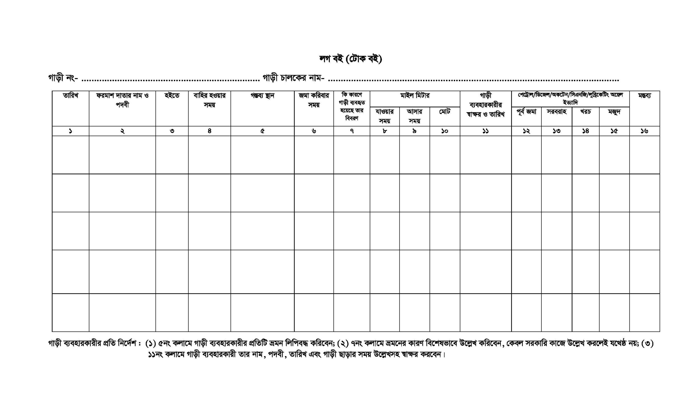 গাড়ি চলাচলের লগবই ফরমের নমুনা সংগ্রহে রাখতে পারেন: ডাউনলোড