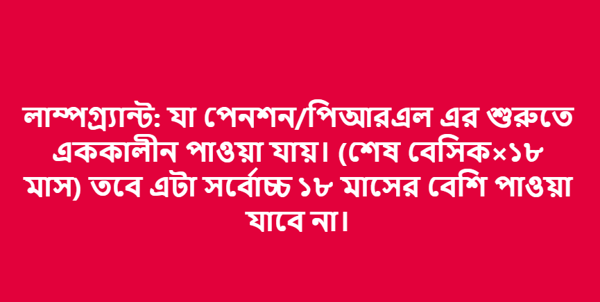 - সূত্র: লাম্প গ্র্যান্ট = (সর্বশেষ মূল বেতন) x (নগদায়নকৃত ছুটির মাস)