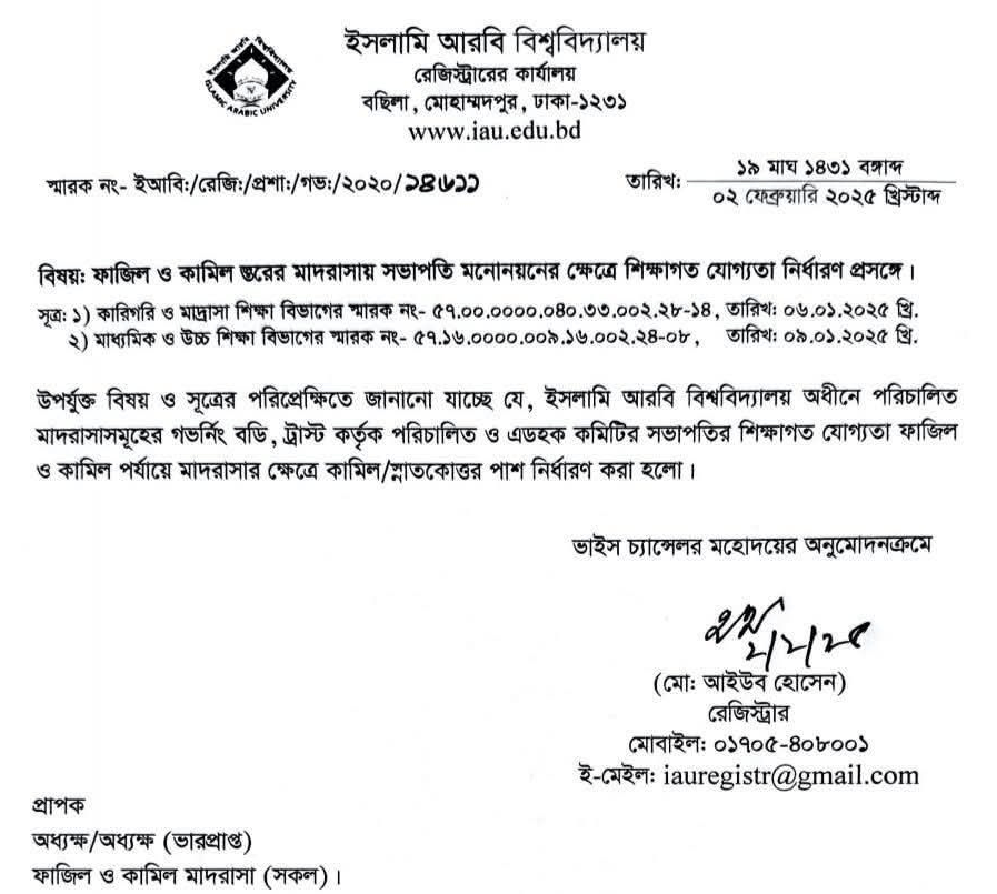 ফাজিল ও কামিল স্তরের মাদরাসায় সভাপতি মনোনয়নের ক্ষেত্রে শিক্ষাগত যোগ্যতা নির্ধারণ করেছে স্নাতক – ফাজিল ও কামিল মাদ্রাসা কমিটি ২০২৫