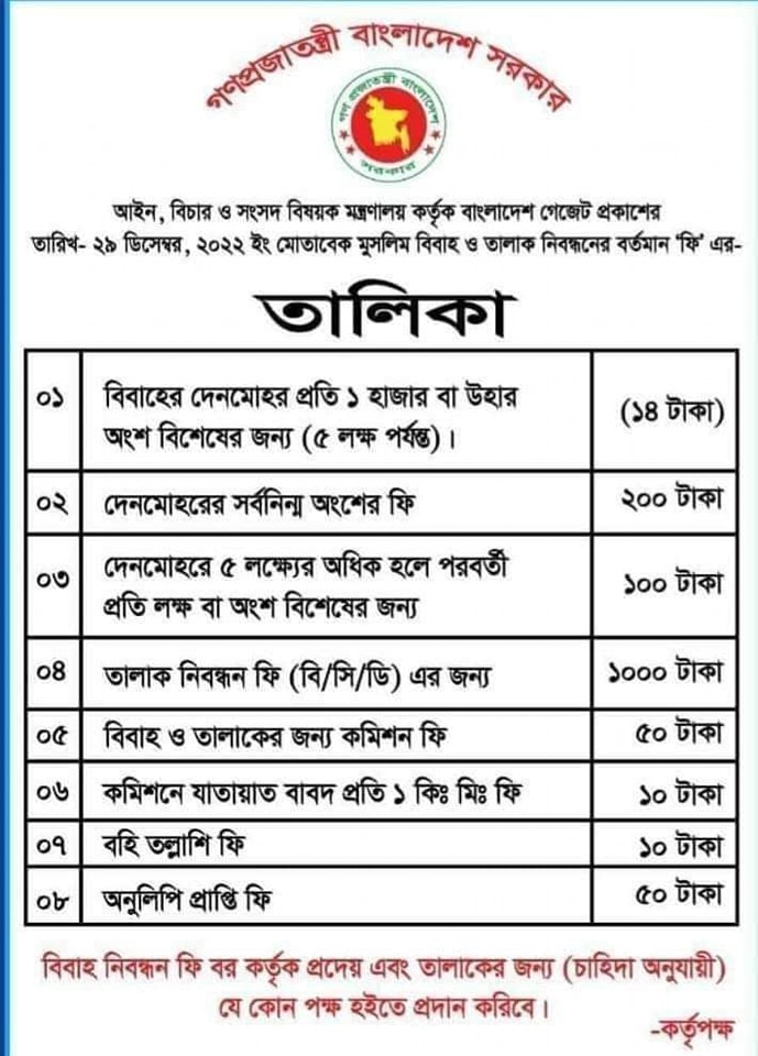 মুসলিম বিবাহ ও তালাক নিবন্ধন (বিধিমালা), ২০০৯’ সংশোধন করে এ ফি বাড়ানো হয়েছে- দেন মোহর বাড়লে কাজীর খরচ বাড়বে এবং রেজিস্ট্রেশন ফি দ্বিগুণ করা হয়েছে – মুসলিম বিবাহ ও তালাক (নিবন্ধন) বিধিমালা, ২০০৯ এর সংশোধন ২০২৫