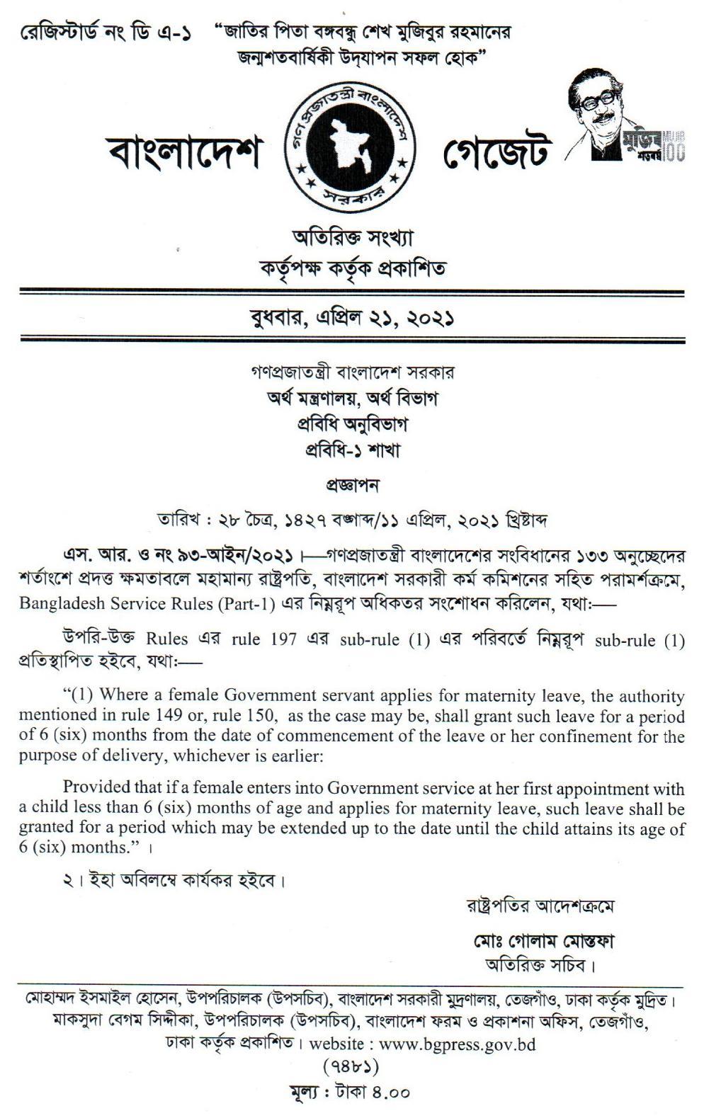 এস.আর.ও নং ৯৩-আইন/২০২১। -গণপ্রজাতন্ত্রী বাংলাদেশের সংবিধানের ১৩৩ অনুচ্ছেদের শর্তাংশে প্রদত্ত ক্ষমতাবলে মহামান্য রাষ্ট্রপতি, বাংলাদেশ সরকারী কর্ম কমিশনের সহিত পরামর্শক্রমে, Bangladesh Service Rules (Part-1) এর নিম্নরূপ অধিকতর সংশোধন করিলেন, যথা:-