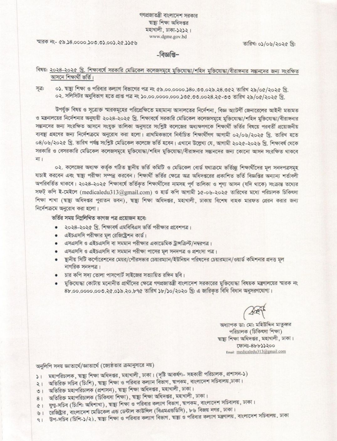 মুক্তিযোদ্ধা কোটা থাকবে না? না। মহামান্য আদালতের নির্দেশনা, বিজ্ঞ অ্যাটর্নী জেনারেলের আইনী মতামত ও মন্ত্রনালয়ের নির্দেশনার অনুযায়ী ২০২৪-২০২৫ খ্রি. শিক্ষাবর্ষে সরকারি মেডিকেল কলেজসমূহে মুক্তিযোদ্ধা/শহিদ মুক্তিযোদ্ধা/বীরাঙ্গনার সন্তানদের জন্য সংরক্ষিত আসনে সংযুক্ত তালিকা অনুসারে সংশ্লিষ্ট কলেজের অধ্যক্ষগণকে শিক্ষার্থী ভর্তির বিষয়ে পরবর্তী প্রয়োজনীয় ব্যবস্থা গ্রহণের জন্য নির্দেশক্রমে অনুরোধ করা হলো। প্রাথমিকভাবে নির্বাচিত শিক্ষার্থীগণ আগামী ০২/০৬/২০২৫ খ্রি. তারিখ হতে ০৪/০৬/২০২৫ খ্রি. তারিখ পর্যন্ত সংশ্লিষ্ট মেডিকেল কলেজে ভর্তি হবেন। এখানে উল্লেখ্য যে, আগামী ২০২৫-২০২৬ খ্রি. শিক্ষাবর্ষ থেকে সরকারি ও বেসরকারি মেডিকেল কলেজসমূহে মুক্তিযোদ্ধা/শহিদ মুক্তিযোদ্ধা/বীরাঙ্গনার সন্তানদের জন্য কোনো আসন সংরক্ষিত থাকবে না।