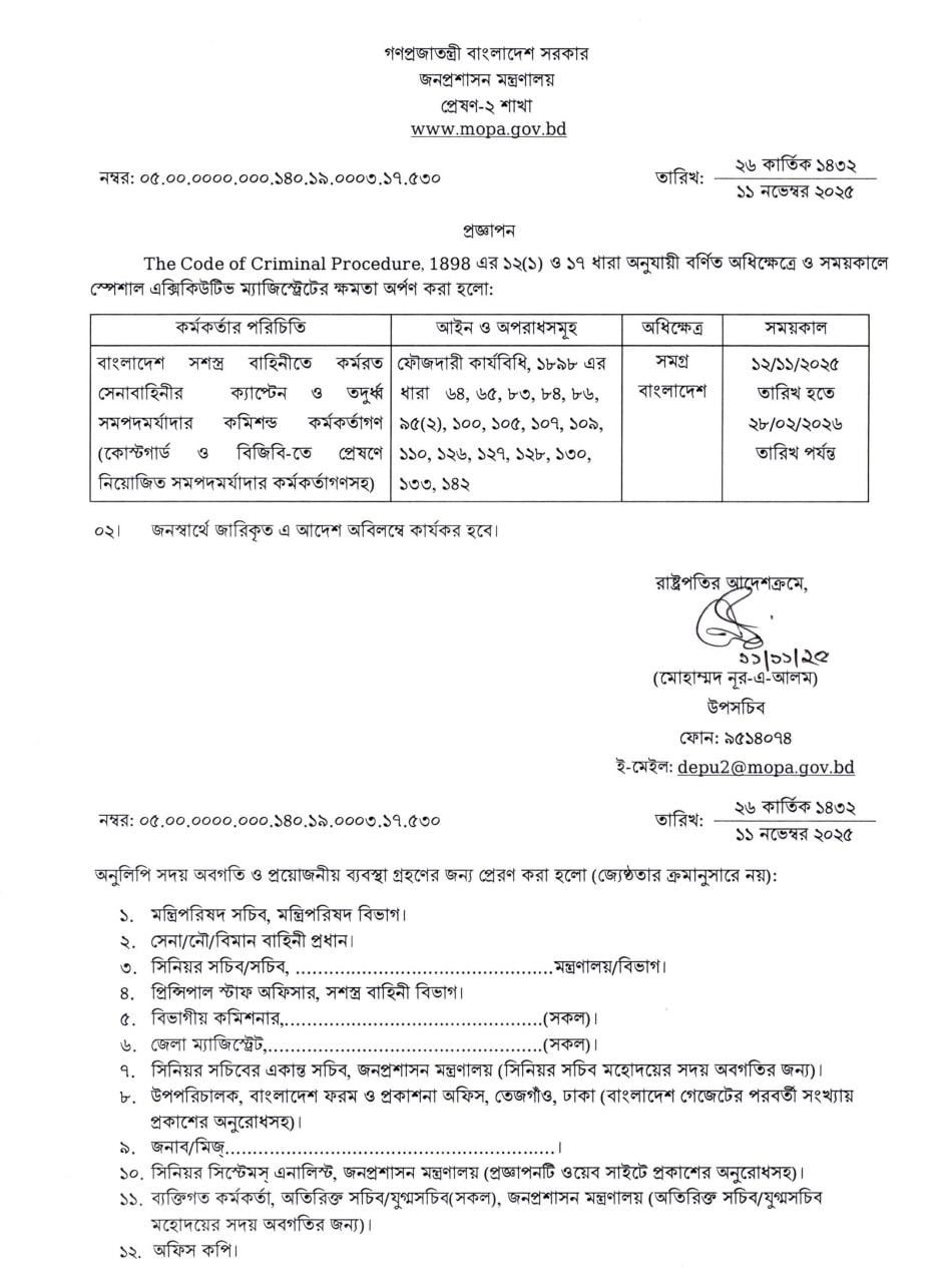 ম্যাজিস্ট্রেড সেনাবাহিনীর কার্যসীমা ২০২৫ । যে সকল অপরাধের ধারা প্রয়োগ করতে পারবেন