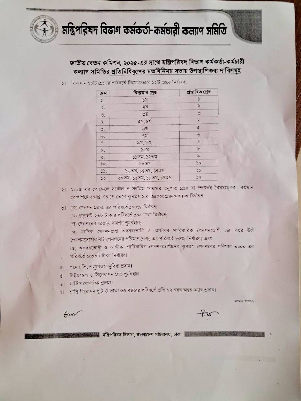 মন্ত্রিপরিষদ বিভাগ কর্মকর্তা-কর্মচারী কল্যাণ সমিতির সভাপতি মোঃ মিজানুর রহমান এবং সাধারণ সম্পাদক মোঃ মনির হোসেন স্বাক্ষরিত এই দাবিনামাটি জাতীয় বেতন কমিশন, ২০২৫-এর কাছে দাখিল করা হয়েছে।