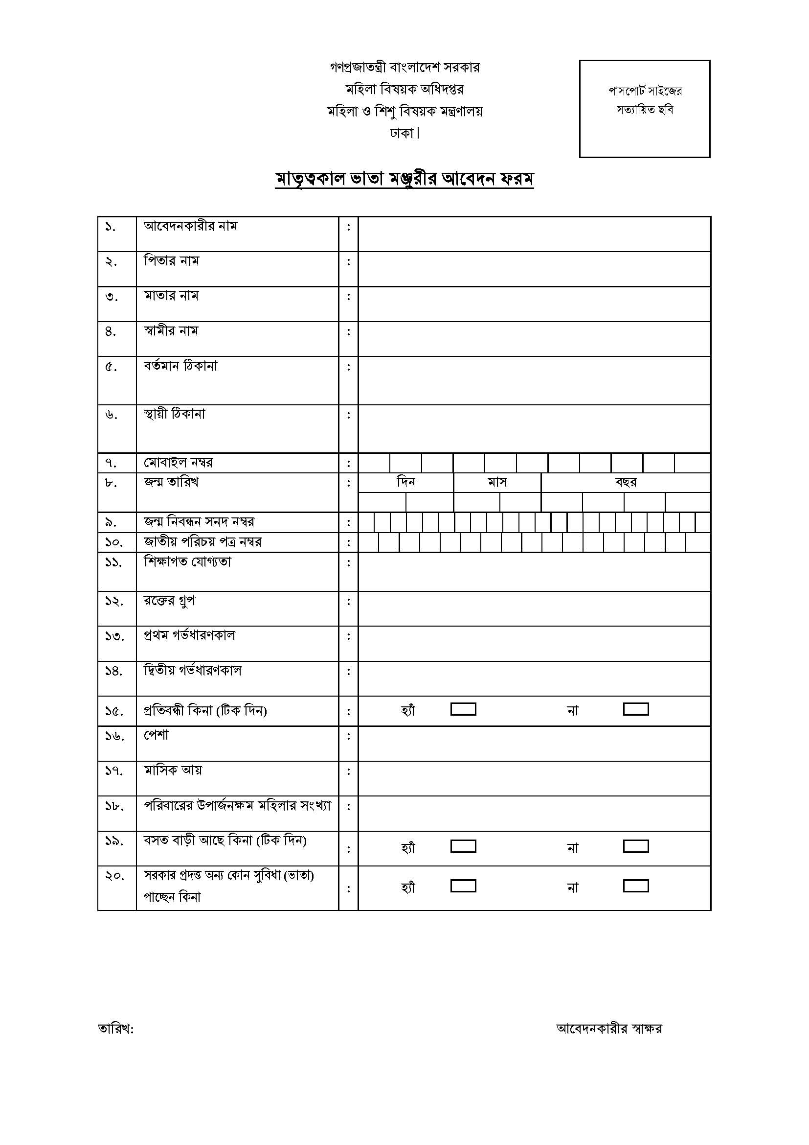ঘরে বসেই কি মাতৃত্বকালীণ ভাতার জন্য আবেদন করা যায়? না। আপনাকে নিচের ফর্মটি পূরণ করে নিয়ে ইউনিয়ন পরিষদে মেম্বার বা ইউপি সদস্যের সুপারিশ সহ জমা দিতে হবে। সমাজ সেবা অধিদপ্তর অনলাইনে আবেদন করবে এবং আপনি মোবাইল ব্যাংকিং এর মাধ্যমে সরাসরি টাকা পাবেন।