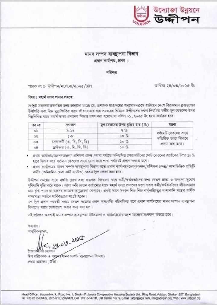 প্রশাসক মহোদয়ের অনুমোদনক্রমে বর্তমানে দেশে বিরাজমান দ্রব্যমূল্যের ঊর্ধ্বগতি এবং উচ্চ মুদ্রাস্ফিতির সাথে জীবনযাত্রার ব্যয় সমন্বয়ের নিমিত্তে উদ্দীপনের সকল নিয়মিত কর্মীর মূল বেতনের উপর নিম্নলিখিত হারে মহার্ঘ ভাতা প্রদানের সিদ্ধান্ত গ্রহণ করা হয়েছে যা ২০২৫ হতে কার্যকর হবে-মহার্ঘ ভাতা মঞ্জুরী ২০২৫
