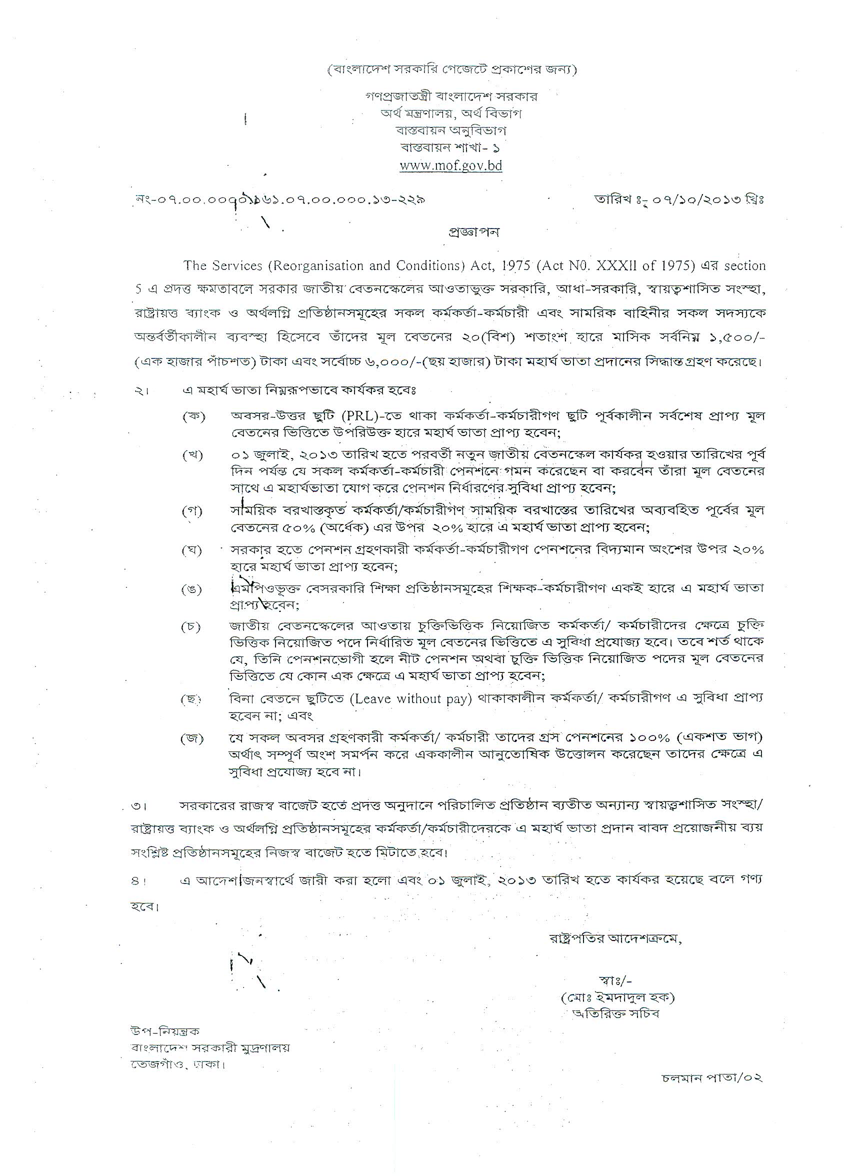 - সরকার হতে পেনশন গ্রহণকারী কর্মকর্তা-কর্মচারীগণ পেনশনের বিদ্যমান অংশের উপর ২০% হারে মহার্ঘ ভাতা প্রাপ্য হতে পারেন।