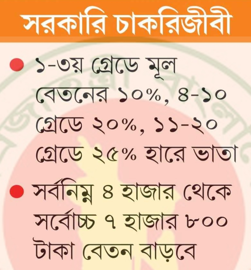 | সর্বনিম্ন বেতন বৃদ্ধি ৪,০০০ টাকা এবং সর্বোচ্চ বেতন বৃদ্ধি ৭,৮০০ টাকা মহার্ঘ ভাতা ধার্য্য হতে পারে। | কোনো চাকরিজীবী ৪,০০০ টাকার কম মহার্ঘ ভাতা পাবেন না। | ১ জানুয়ারি ২০২৫ হতে কার্যকর হতে পারে। |