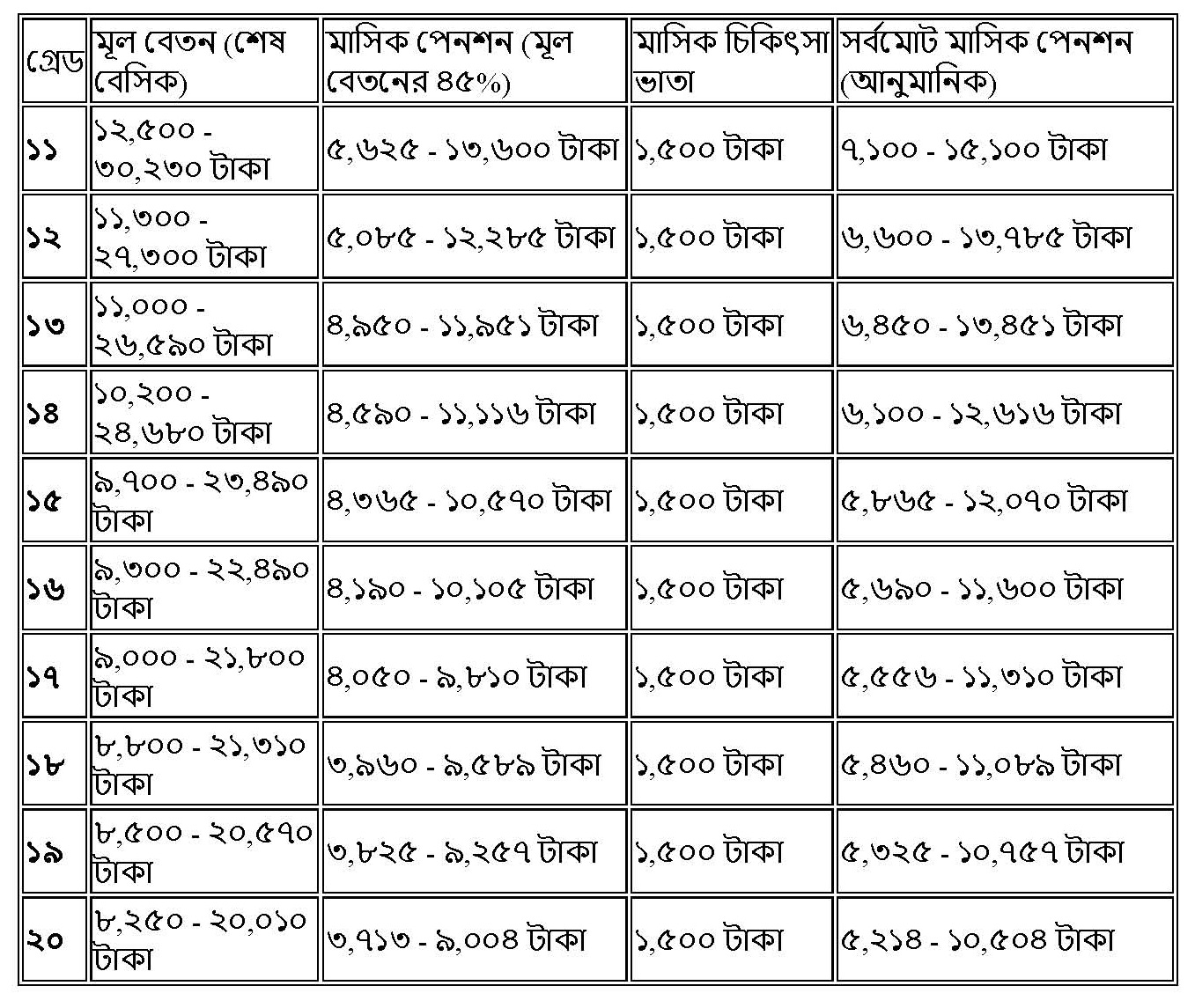 সর্বমোট মাসিক পেনশন ২০২৫-সরকারি কর্মচারী ১১-২০ গ্রেড যাদের তাদের মাসিক পেনশন কত?