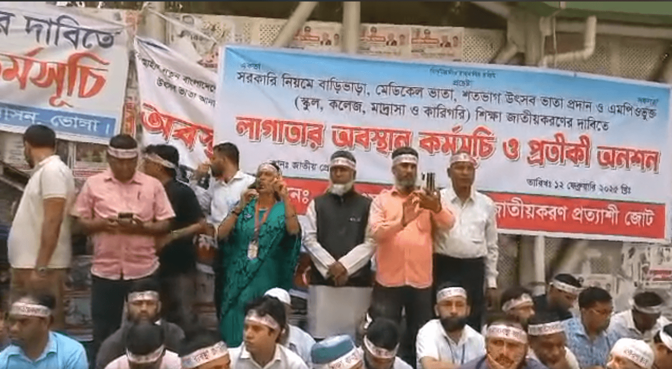 সরকারি নিয়মে বাড়ি ভাড়া ভাতা, মেডিকেল ভাতা, শতভাগ উৎসব ভাতা প্রাপ্তির জন্য এমপিওভূক্ত করণের দাবী করেছে এমপিওভুক্ত শিক্ষা জাতীয়করণ প্রত্যাশী জোট–বেসরকারি শিক্ষকদের অবস্থান কর্মসূচি ২০২৫