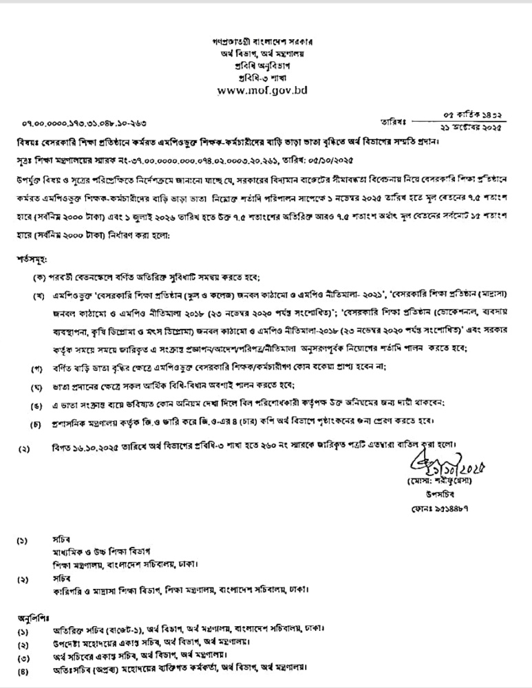 - প্রথম ধাপ: চলতি অর্থ বছরে আগামী ১ নভেম্বর ২০২৫ থেকে মূল বেতনের ৭.৫ শতাংশ (ন্যূনতম ২,০০০ টাকা) বাড়িভাড়া ভাতা কার্যকর হবে।