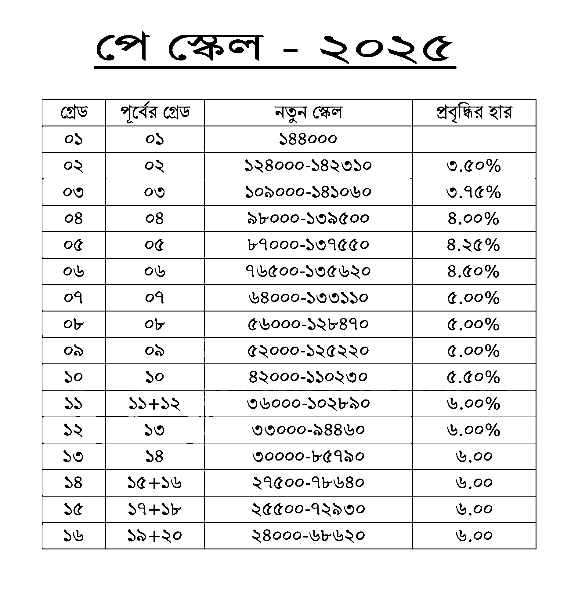 | গ্রেড | পূর্বের গ্রেড | প্রস্তাবিত নতুন স্কেল (টাকা) | প্রবৃদ্ধির হার (বার্ষিক) |