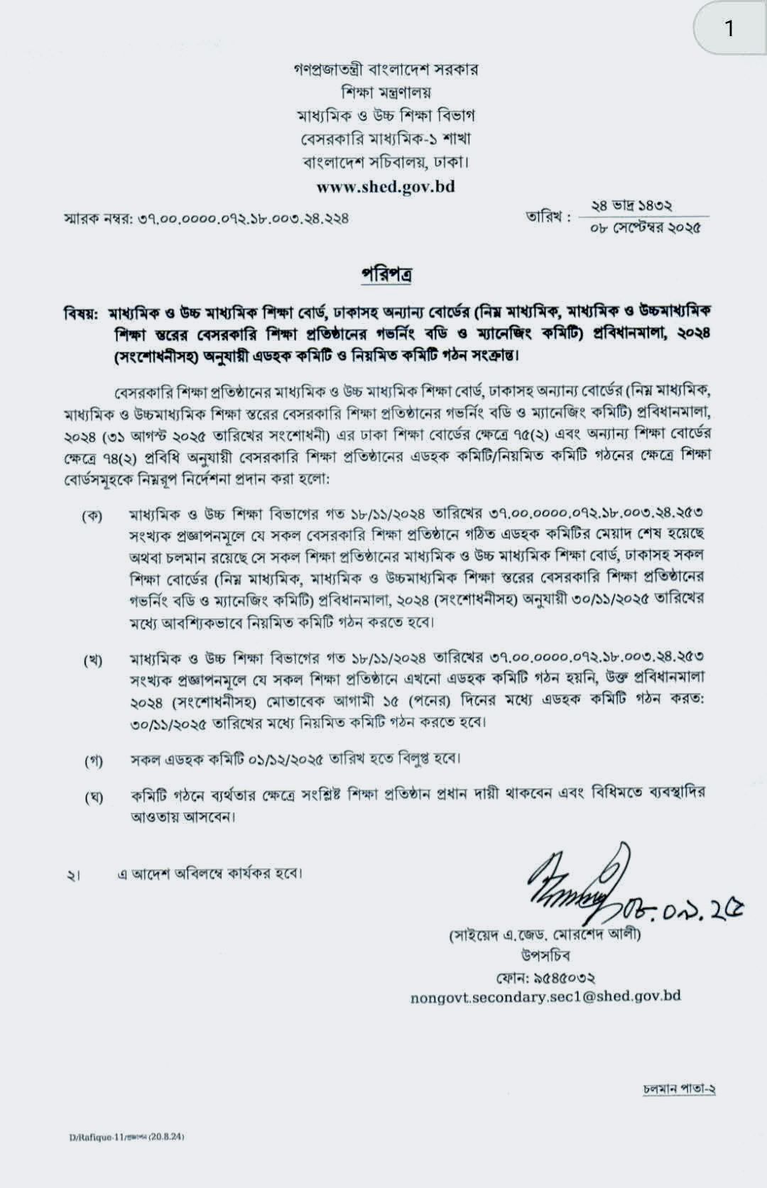 বেসরকারি শিক্ষাপ্রতিষ্ঠানে নিয়মিত কমিটি গঠন ২০২৫ । আগামী ৩০ নভেম্বরের মধ্যে এডহক কমিটি গঠনের নির্দেশনা?