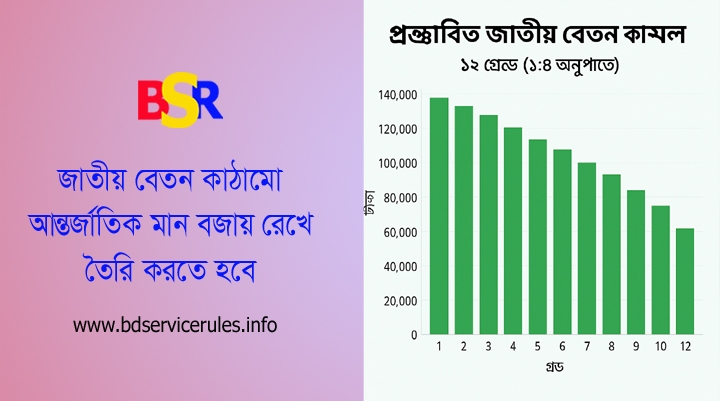 ২০টি গ্রেডের পরিবর্তে ১২টি গ্রেড করার প্রস্তাব বেতন কাঠামোকে অনেক সহজ করবে। সর্বনিম্ন ও সর্বোচ্চ বেতনের মধ্যে অনুপাত ১:৪ নির্ধারণ করা হলে বেতন-ভাতার বৈষম্য কমে আসবে। সম্ভাব্য ১২ গ্রেডের বেতন কাঠামো দেওয়া হলো, যেখানে সর্বনিম্ন বেতন ৩৫,০০০ টাকা এবং ১:৪ অনুপাতে সর্বোচ্চ বেতন নির্ধারিত হবে (অর্থাৎ সর্বোচ্চ বেতন ১,৪০,০০০ টাকা)।