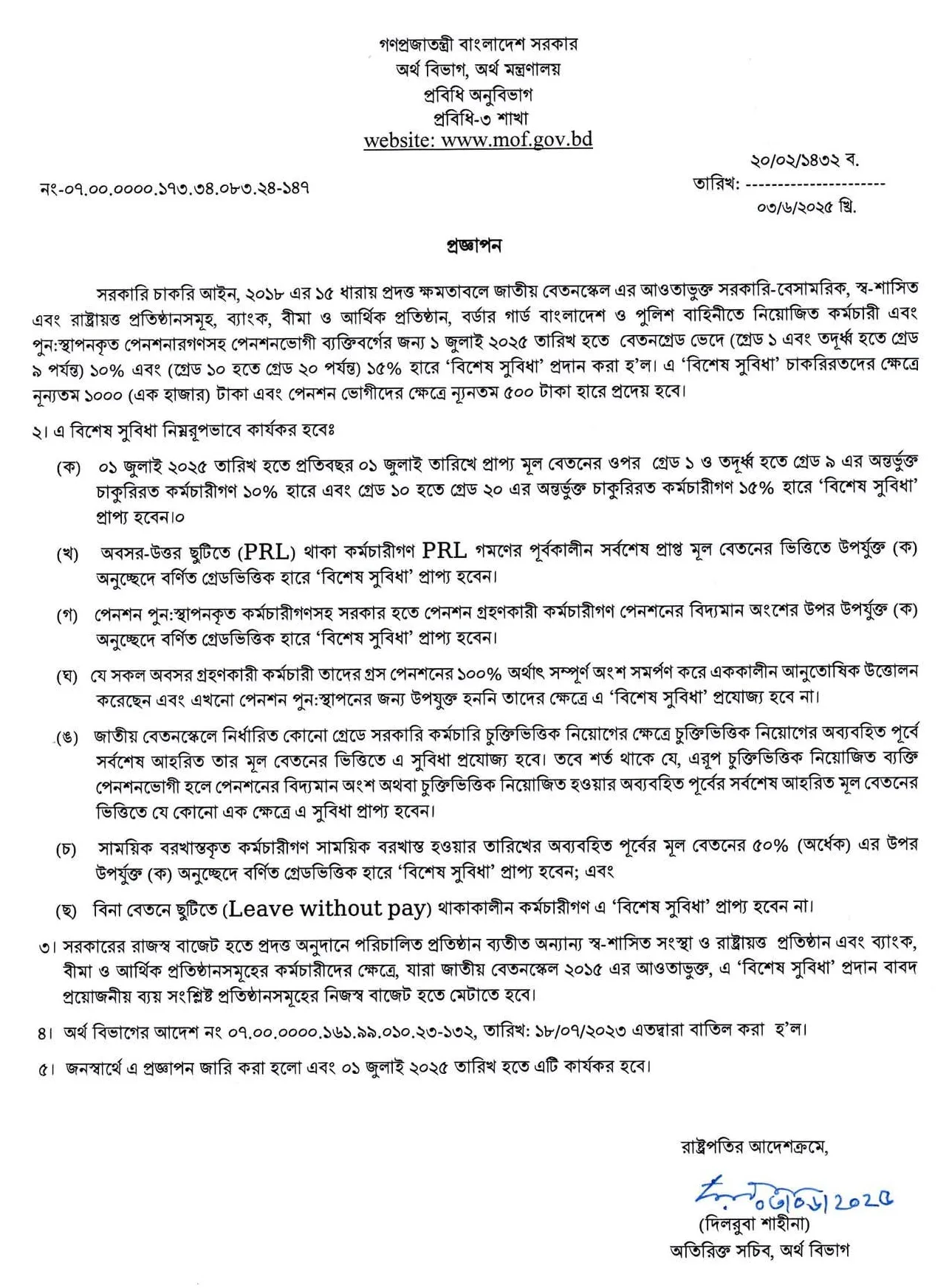 নতুন বিশেষ সুবিধা প্রজ্ঞাপন ২০২৫ । সরকারি কর্মচারীদের বেতন কত বাড়বে?