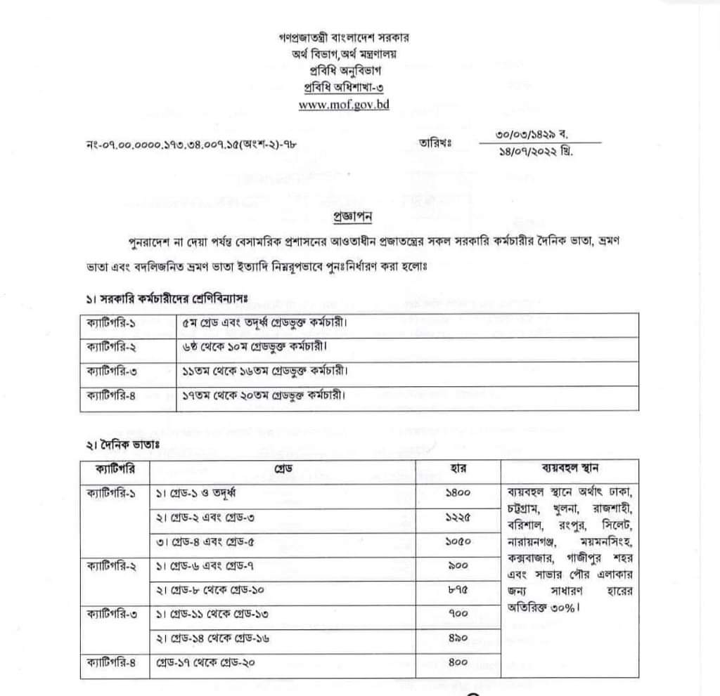 - গ্রেড (১) ও তদূর্ধ্ব দৈনিক ভাতা ১৪০০