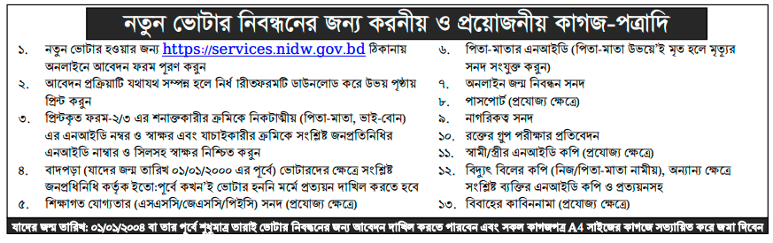- ভোটার নিবন্ধন ফরমের স্লিপ নম্বর (যা ছবি তোলা ও ফিঙ্গার দেওয়ার সময় যে কাগজ দেয় সেখানে নম্বর দেয়া থাকে।