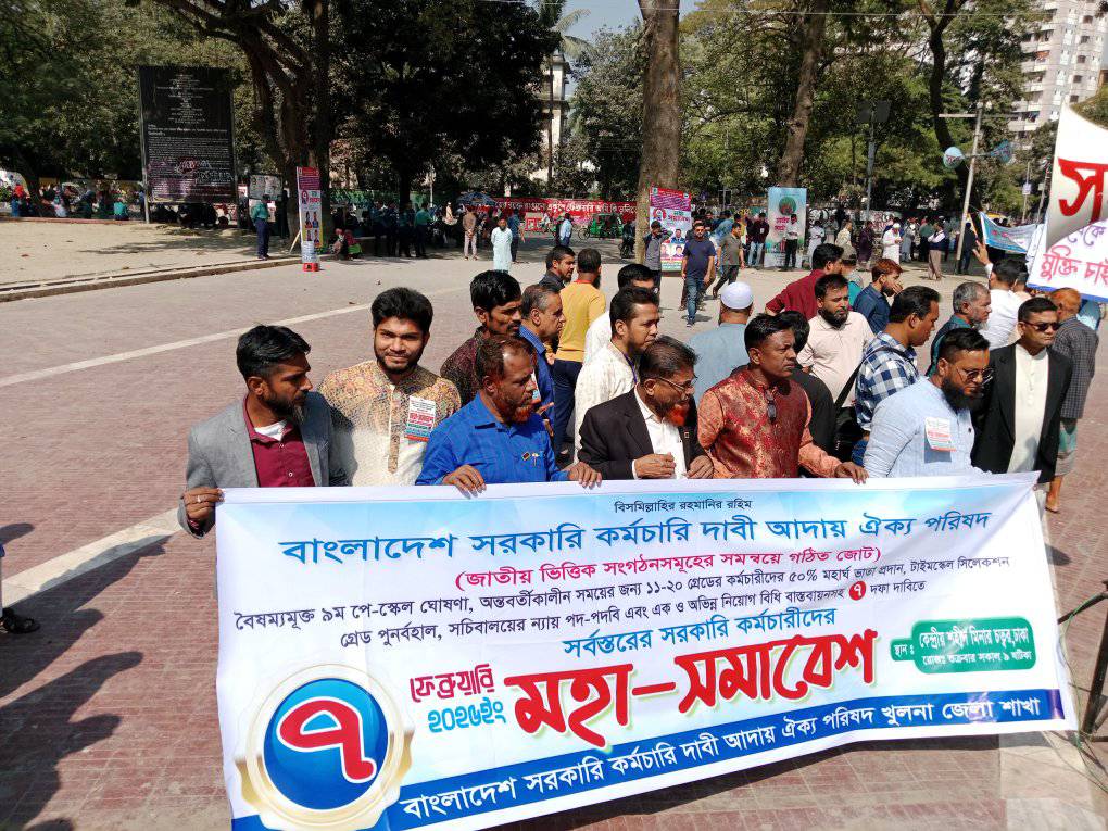 সমাবেশ কখন শুরু হয়? বাংলাদেশ সরকারি কর্মচারি দাবি আদায় ঐক্য পরিষদ এর উদ্যোগে বৈষম্যহীন ৯ম পে-স্কেল ঘোষনাসহ ৭ দফা দাবী বাস্তবায়ন না করে অর্থ মন্ত্রণালয় কর্তৃক গঠিত মহার্ঘ্য ভাতা প্রদান কমিটির গড়িমশির প্রতিবাদে ও মুদ্রাস্ফীতির সাথে সংগতি রেখে বেতন বৃদ্ধির বিষয়টি বাস্তবায়নের লক্ষে বর্তমান সময়ের সাথে সংগতি রেখে বাড়ী ভাড়া ভাতা, রেশনিং পদ্ধতি চালু, চিকিৎসা ভাতা, শিক্ষা সহায়ক ভাতা, যাতায়াত ভাতা ও টিফিন ভাতাদি প্রদানের দাবিতে অদ্য ০৭ ফেব্রুয়ারি ২০২৫ খ্রি. রোজ-শুক্রবার, সকাল ০৯.০০ টায় কেন্দ্রীয় শহীদ মিনার, ঢাকায় মহাসমাবেশ অনুষ্ঠিত হয়।