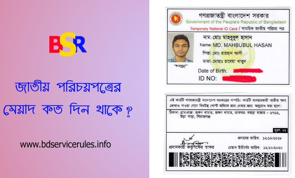 জাতীয় পরিচয় পত্রের মেয়াদ কতদিন? বাংলাদেশে জাতীয় পরিচয়পত্র (NID) সাধারণত ইস্যুর তারিখ থেকে ১৫ বছর পর্যন্ত বৈধ থাকে। জাতীয় পরিচয়পত্রের মেয়াদ ইস্যুর তারিখ থেকে ১৫ বছর। মেয়াদ শেষ হলে নাগরিকদের নির্ধারিত ফি পরিশোধ করে উপজেলা নির্বাচন অফিসে আবেদন করে নতুন NID কার্ড সংগ্রহ করতে হবে।
