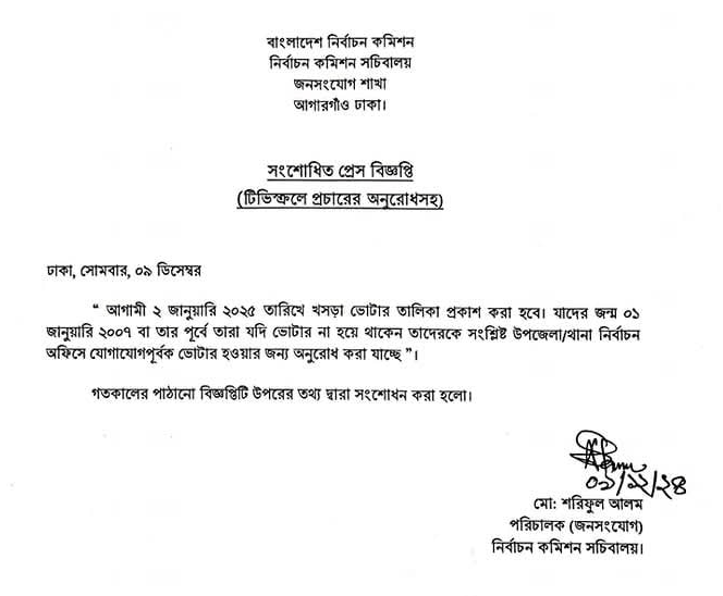 আগামী ২ জানুয়ারি ২০২৫ তারিখে খসড়া ভোটার তালিকা প্রকাশ করা হবে। যাদের জন্ম ১ জানুয়ারি ২০০৭ বা তার পূর্বে তারা যদি ভোটার না হয়ে থাকেন তাদেরকে সংশ্লিষ্ট উপজেলা অথবা থানা নির্বাচন অফিসে যোগাযোগ পূর্বক ভোটার হওয়ার জন্য অনুরোধ করেছে নির্বাচন কমিশন সচিবালয়।