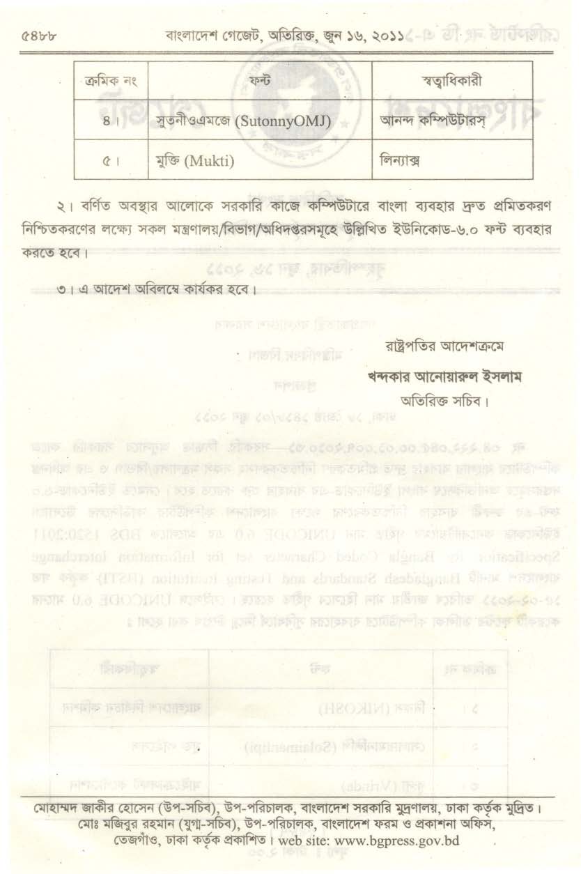 সরকারি কাজে কম্পিউটারে বাংলার ব্যবহার দ্রুত প্রমিতকরণ নিশ্চিতকরণসহ সকল মন্ত্রণালয়/ বিভাগ ও এর অধিনস্ত দপ্তরসমূহে অনতিবিলম্বে বাংলা ইউনিকোড-এর ব্যবহার শুরু করা নির্দেশ প্রদান করে গেজেট প্রকাশ করা হয়েছে।