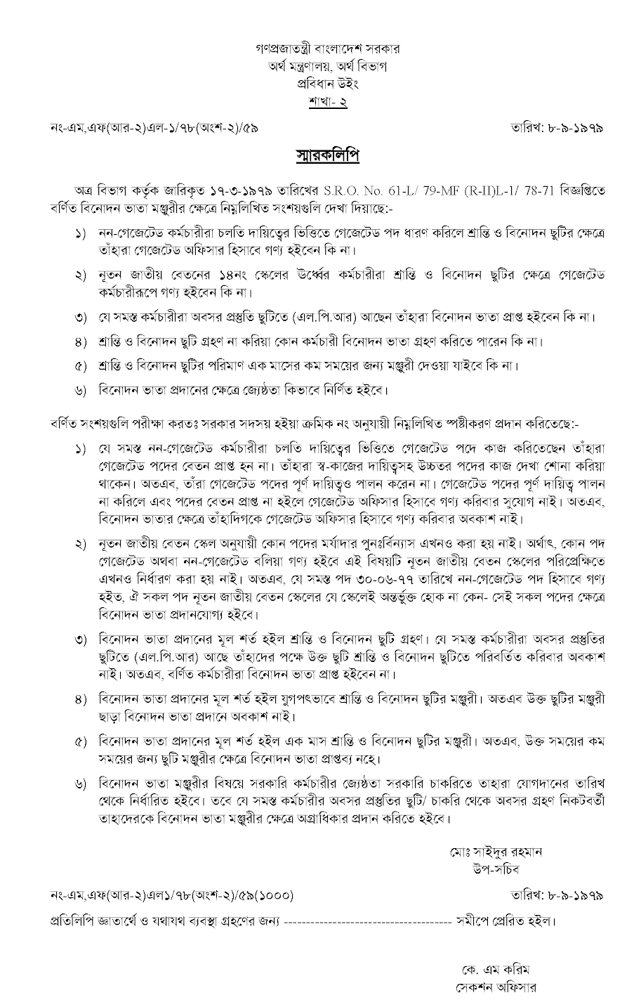 অর্থ মন্ত্রনালয়ের ৮-৯-১৯৭৯ খ্রি: তারিখের এম,এফ(আর-২)এল-১/৭৮(অংশ-২)/৫৯ নম্বর স্মারকলিপি মোতাবেক উক্ত দপ্তরের পূর্বে জারিকৃত ১৭-০৩-১৯৭৯ তারিখের S.RO No. 61-L/79-MF(R-IDL-1/78-71 নংর বিজ্ঞপ্তিতে নিম্ন বর্ণিত বিনোদন ভাতা মঞ্জুরীর ক্ষেত্রে সংশয়গুলি দেখা দিয়েছে-NO Allowance No Leave 2025