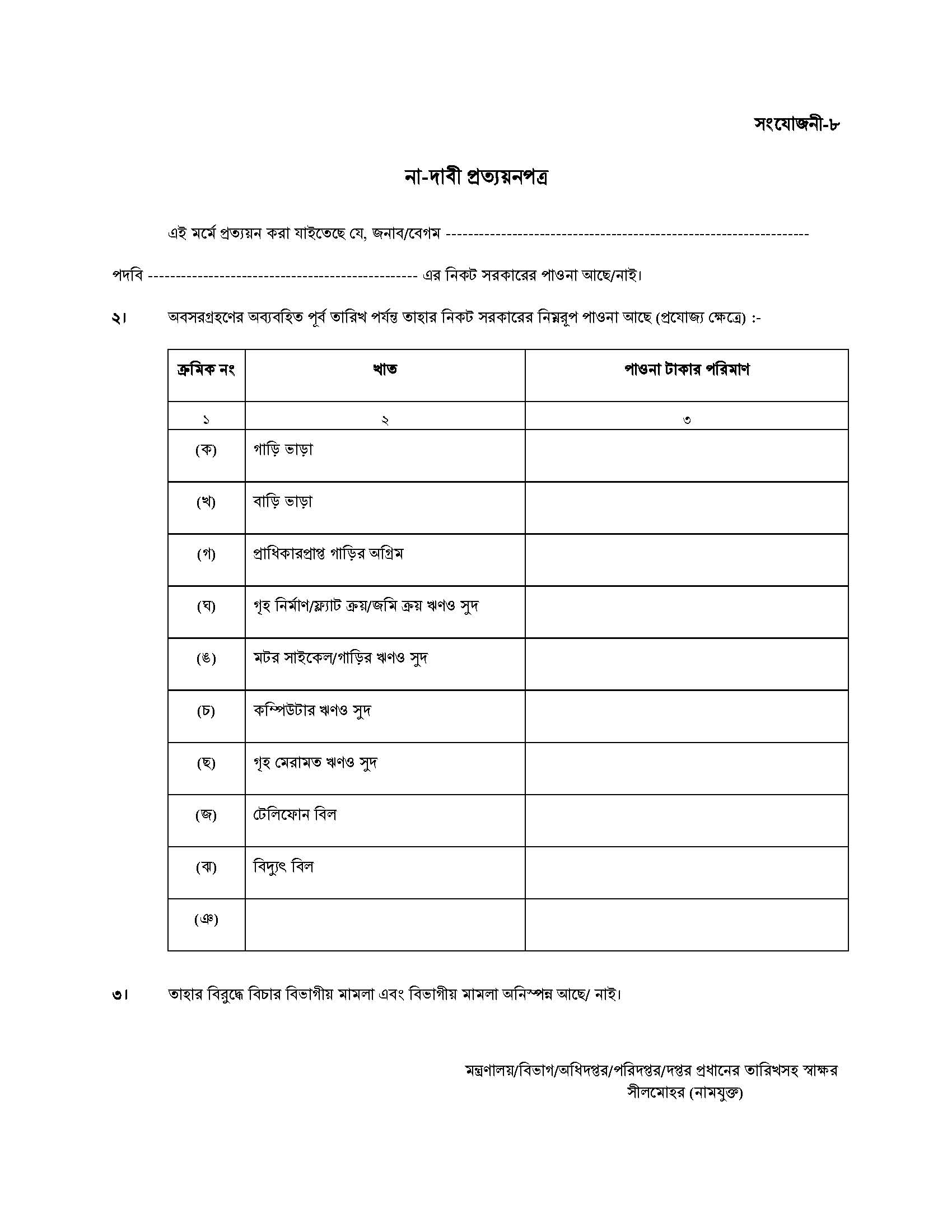 - উত্তর: চাকরিকালে দপ্তর আপনার নিকট কোন পাওনা নাই মর্মে প্রত্যয়ন পত্র নিতে হয়।