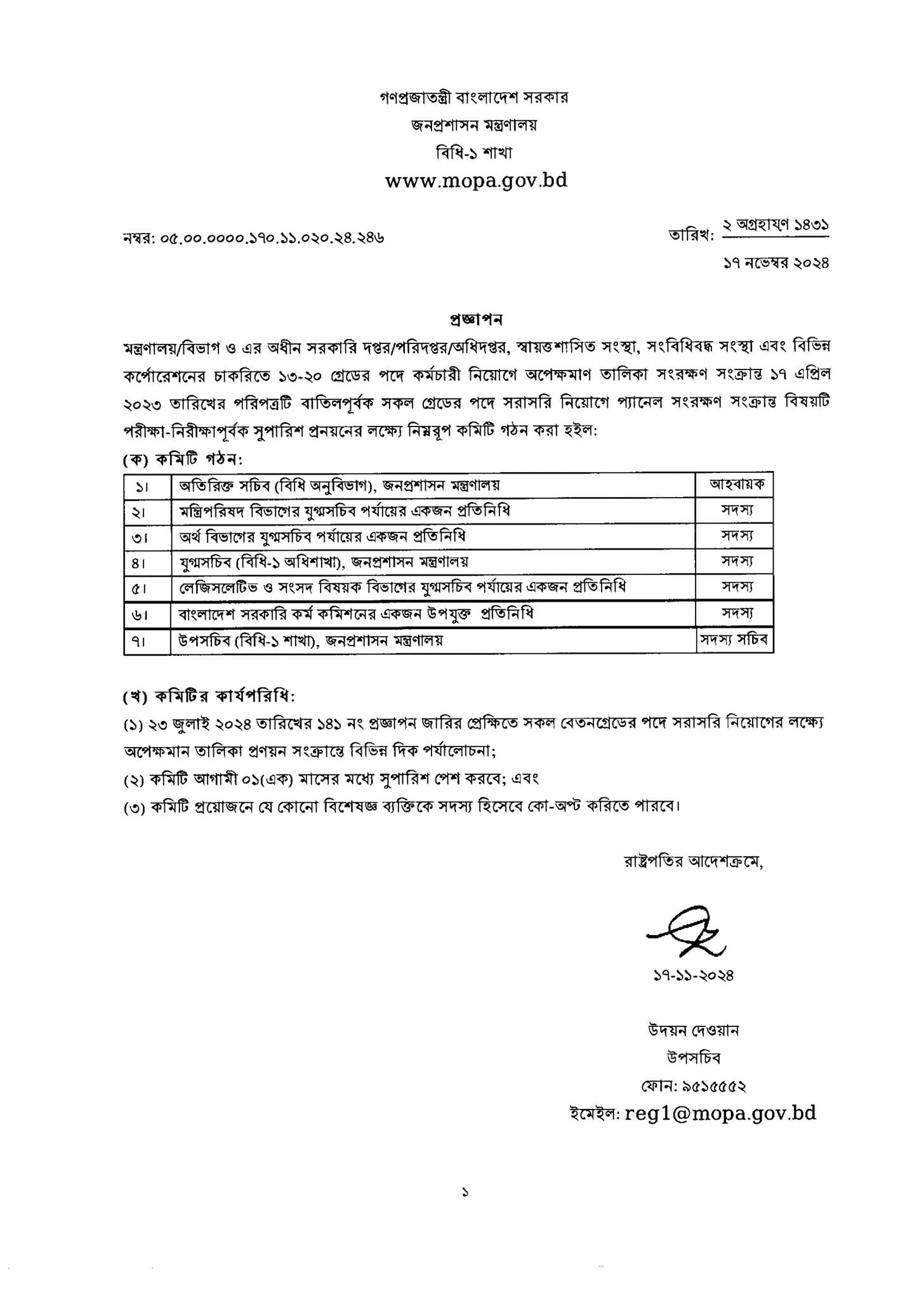 নতুন কমিটির কার্যপরিধি কি হবে? ২৩ জুলাই ২০২৪ তারিখের ১৪১ নং প্রজ্ঞাপন জারির প্রেক্ষিতে সকল বেতনগ্রেডের পদে সরাসরি নিয়োগের লক্ষ্যে অপেক্ষমান তালিকা প্রণয়ন সংক্রান্তে বিভিন্ন দিক পর্যালোচনা করবে। কমিটি আগামী ০১(এক) মাসের মধ্যে সুপারিশ পেশ করবে এবং কমিটি প্রয়োজনে যে কোনো বিশেষজ্ঞ ব্যক্তিকে সদস্য হিসেবে কো-অপ্ট করিতে পারবে।