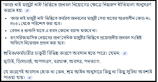 সরকারী অফিসে/স্বায়ত্বশাসিত সংস্থায়/উন্নয়ন প্রকল্পে দাপ্তরিক প্রয়োজন অনুযায়ী ‘কাজ নাই মজুরী নাই’ ভিত্তিতে জনবল নিয়োজন করা হলে একই নীতিমালা অনুসরণ করা হবে-NO Work NO Pay 2025