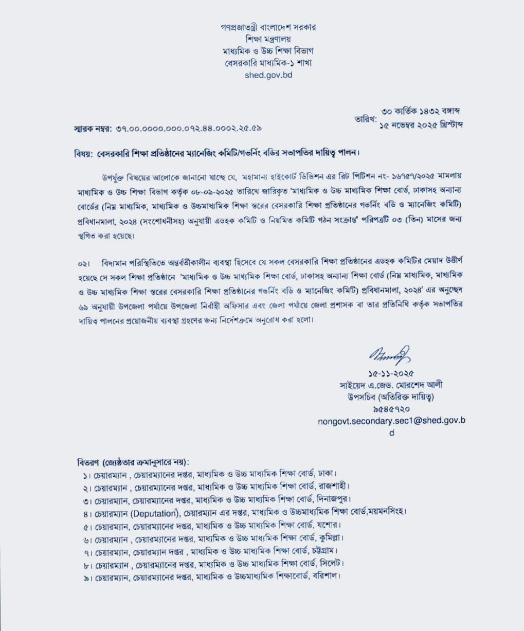 মন্ত্রণালয়ের পরিপত্রে উল্লেখ করা হয়েছে, মহামান্য হাইকোর্ট ডিভিশনের রিট পিটিশন নং-১৬৭৫৭/২০১৫ মামলায় মাধ্যমিক ও উচ্চ শিক্ষা বিভাগ কর্তৃক গত ০৮ সেপ্টেম্বর ২০২৫ তারিখে জারি করা ‘মাধ্যমিক ও উচ্চ মাধ্যমিক শিক্ষা বোর্ড, ঢাকাসহ অন্যান্য বোর্ডের (নিম্ন মাধ্যমিক, মাধ্যমিক ও উচ্চমাধ্যমিক শিক্ষা স্তরের বেসরকারি শিক্ষা প্রতিষ্ঠানের গভর্নিং বডি ও ম্যানেজিং কমিটি) প্রবিধানমালা, ২০২৪ (সংশোধনীসহ) অনুযায়ী অ্যাডহক কমিটি ও নিয়মিত কমিটি গঠন সংক্রান্ত’ পরিপত্রটি তিন মাসের জন্য স্থগিত করা হয়েছে।