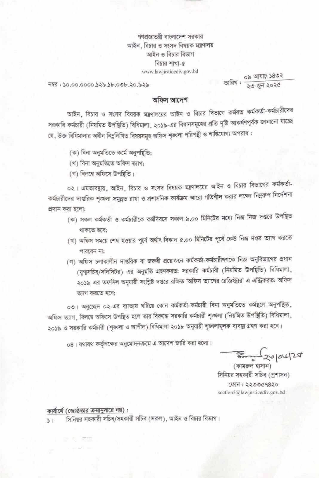 আইন, বিচার ও সংসদ বিষয়ক মন্ত্রণালয়ের আইন ও বিচার বিভাগে কর্মরত কর্মকর্তা-কর্মচারীদের সরকারি কর্মচারী (নিয়মিত উপস্থিতি) বিধিমালা, ২০১৯-এর বিধানসমূহের প্রতি দৃষ্টি আকর্ষণপূর্বক জানানো যাচ্ছে যে, উক্ত বিধিমালার অধীন নিম্নলিখিত বিষয়সমূহ অফিস শৃঙ্খলা পরিপন্থী ও শাস্তিযোগ্য অপরাধ -উপস্থিতি বিধিমালা ২০২৫