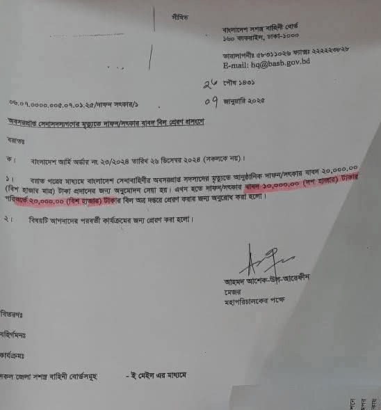 একজন সেনা সদস্যের মৃত্যু ২০২৫ । যে সকল অবসরপ্রাপ্ত সেনাসদস্য স্বাভাবিক মৃত্যু বরণ করবেন তাদের কাপন দাফন বাবদ পূর্বের ১০,০০০/= (দশ হাজার) টাকার পরিবর্তে এখন হতে ২০,০০০/= (বিশ হাজার) টাকা পাবেন।