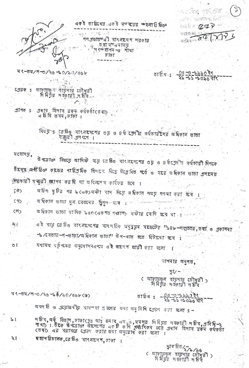 বিষয়: রেডিও বাংলাদেশের ৩য় ও ৪র্থ শ্রেণীর কর্মচারীদের অধিকাল ভাতা মঞ্জুরী প্রসংগে।