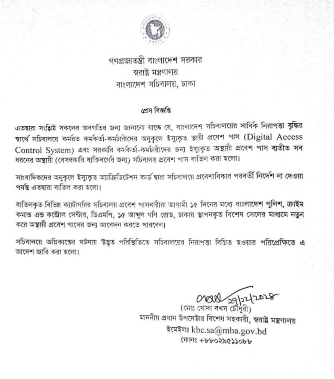 বাংলাদেশ সচিবালয়ের সার্বিক নিরাপত্তা বৃদ্ধির স্বার্থে সচিবালয়ে কর্মরত কর্মকর্তা-কর্মচারীদের অনুকূলে ইস্যুকৃত স্থায়ী প্রবেশ পাস (Digital Access Control System) এবং সরকারি কর্মকর্তা-কর্মচারীদের জন্য ইস্যুকৃত অস্থায়ী প্রবেশ পাস ব্যতীত সব ধরনের অস্থায়ী (বেসরকারি ব্যক্তিবর্গের জন্য) সচিবালয় প্রবেশ পাস বাতিল করা হয়েছে-সচিবালয়ে প্রবেশ সংরক্ষিত ২০২৪