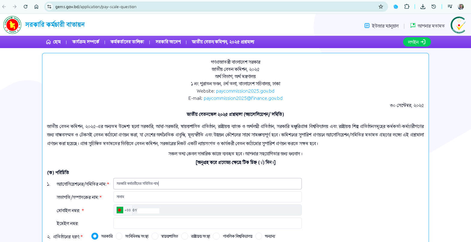 ঢাকা, ৩০ সেপ্টেম্বর, ২০২৫ – গণপ্রজাতন্ত্রী বাংলাদেশ সরকারের জাতীয় বেতন কমিশন, ২০২৫, সরকারি, আধা-সরকারি এবং অন্যান্য রাষ্ট্রায়ত্ত প্রতিষ্ঠানের কর্মকর্তা-কর্মচারীদের জন্য বাস্তবসম্মত ও টেকসই বেতন কাঠামো প্রণয়নের লক্ষ্যে অ্যাসোসিয়েশন/সমিতিগুলোর মতামত গ্রহণের প্রক্রিয়া শুরু করেছে । অর্থ বিভাগ, অর্থ মন্ত্রণালয় কর্তৃক প্রকাশিত এই প্রশ্নমালাটি দেশের অর্থনৈতিক প্রবৃদ্ধি, মূল্যস্ফীতি এবং উন্নয়ন কৌশলের সাথে সামঞ্জস্যপূর্ণ একটি কার্যকর সুপারিশ প্রণয়নে সহায়তা করবে ।-জাতীয় বেতন কমিশন ২০২৫