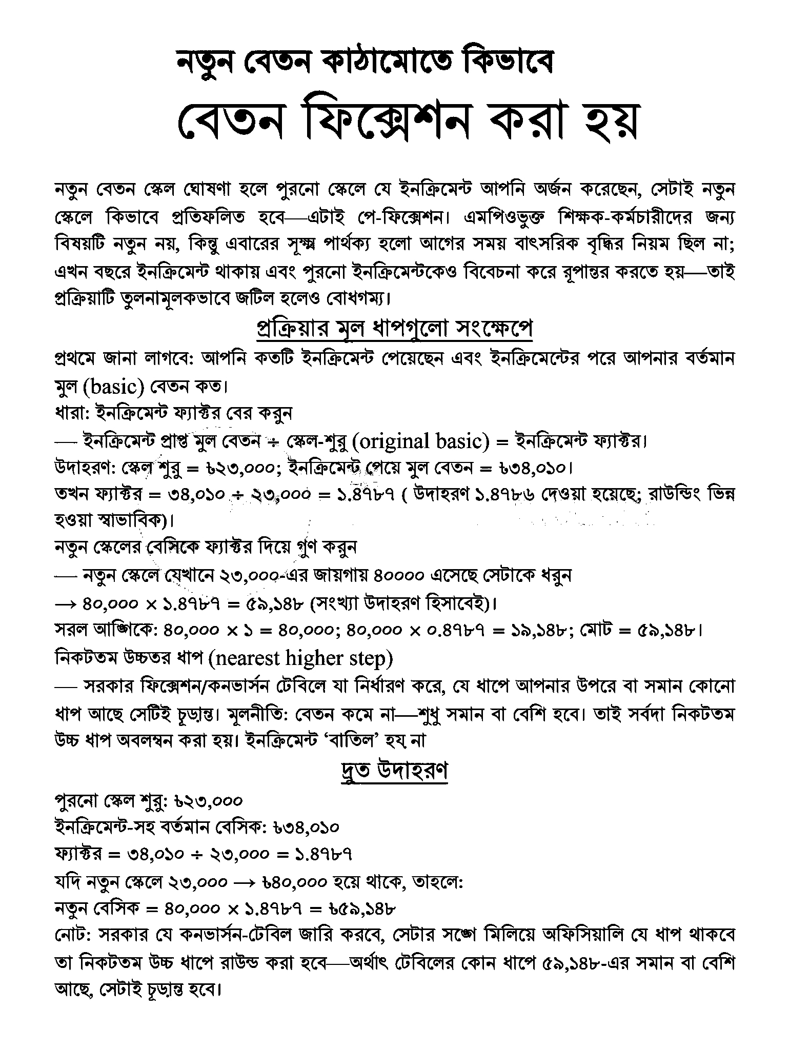 সরকারি শিক্ষক-কর্মচারীসহ সকল স্তরের কর্মকর্তা-কর্মচারীদের জন্য নতুন বেতন কাঠামোতে কীভাবে বেতন ফিক্সেশন বা নির্ধারণ করা হবে, তার বিস্তারিত প্রক্রিয়া সম্প্রতি স্পষ্ট করা হয়েছে। পুরাতন স্কেলে অর্জিত ইনক্রিমেন্ট নতুন স্কেলে কীভাবে প্রতিস্থাপন হবে, তা নিয়ে পূর্বেকার বিভ্রান্তি দূর করে নতুন ফিক্সেশন পদ্ধতি কার্যকর করার নিয়ম জারি হয়েছে।