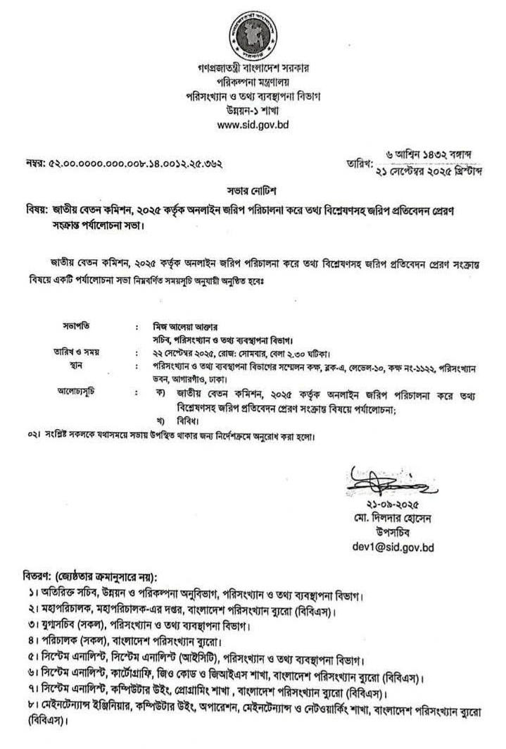 ২২ সেপ্টেম্বরের বৈঠকে গুরুত্বপূর্ণ আলোচনা– জাতীয় বেতন কমিশন, ২০২৫ কর্তৃক অনলাইন জরিপ পরিচালনা ও তথ্য বিশ্লেষণসহ জরিপ প্রতিবেদন প্রেরণের বিষয়ে একটি গুরুত্বপূর্ণ পর্যালোচনা সভা অনুষ্ঠিত হয়েছে। পরিসংখ্যান ও তথ্য ব্যবস্থাপনা বিভাগের সিনিয়র সচিবের সভাপতিত্বে এই বৈঠকটি ২২ সেপ্টেম্বর, ২০২৫ তারিখ রোজ সোমবার বেলা ২:০০ ঘটিকায় পরিসংখ্যান ভবনে অনুষ্ঠিত হয়। বৈঠকে সরকারি কর্মচারীদের পে স্কেল দেওয়া নিয়ে আলোচনার প্রেক্ষিতে এই অনলাইন জরিপের জন্য প্রশ্নপত্র তৈরির কাজ চলছে বলে জানা যায়।