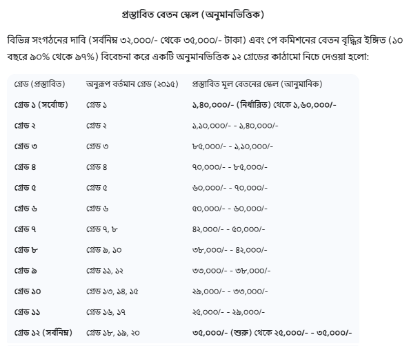 | বিষয় | বর্তমান পরিস্থিতি (জাতীয় বেতনস্কেল, ২০১৫) | প্রস্তাবিত পরিবর্তন (কর্মচারী দাবি/কমিশন প্রবণতা) |
