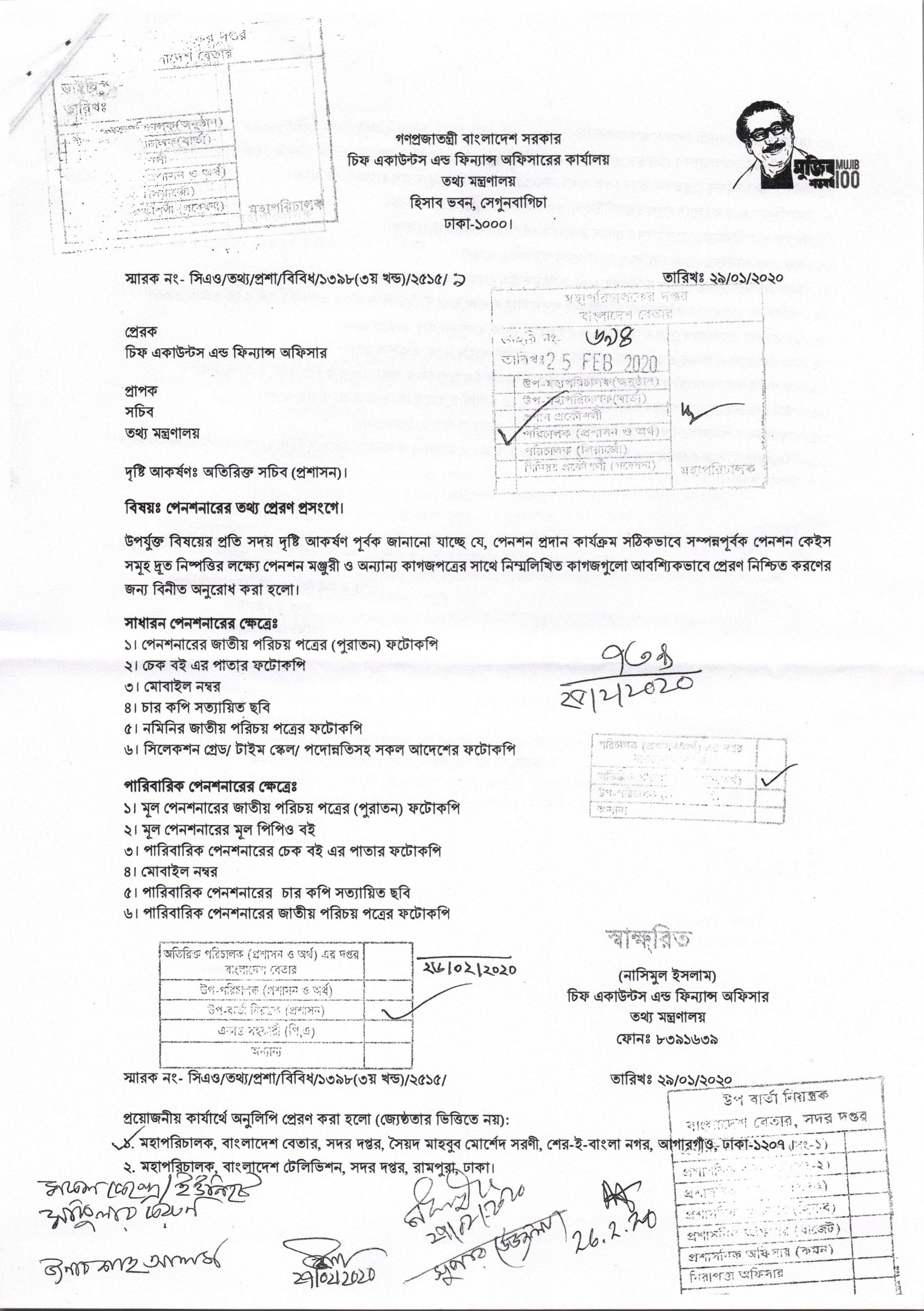 গত ২৯-০১-২০২০ খ্রি: তারিখে চিফ একাউন্টস এন্ড ফিন্যান্স অফিসারের কার্যালয়, তথ্য মন্ত্রণালয়, হিসাব ভবন, সেগুনবাগিচা, ঢাকার স্মারক নং -সিএও/তথ্য/প্রশা/বিবিধ/১৩৯৮(৩য় খন্ড)২৫১৫/১ নম্বর পত্রের মাধ্যমে কিছু অতিরিক্ত তথ্য প্রেরণ করতে বলা হয়েছে-Pension Document That Mandatory 2025