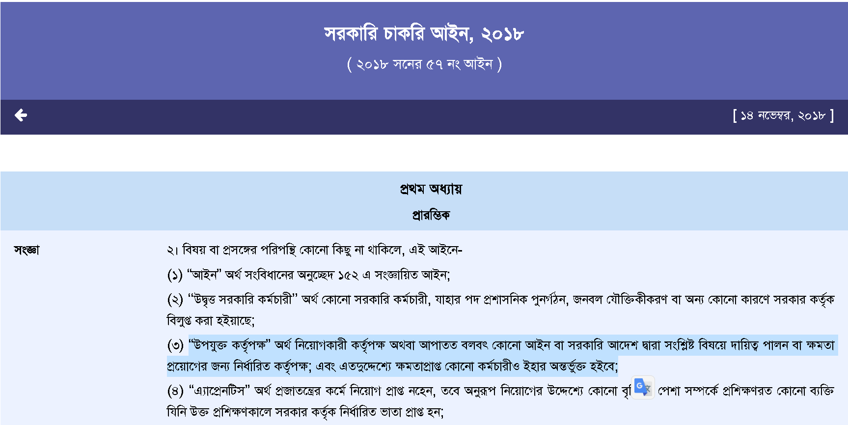 সরকারি চাকরি আইন, ২০১৮ এর দশম অধ্যায়ের ৩২ নং অনুচ্ছেদ অনুসারে কেবলমাত্র নিয়োগকারী কর্তৃপক্ষকে লঘু ও গুরু দন্ড আরোপের ক্ষমতা দেওয়া হয়েছে। যাহার কারণে নিয়োগকারী কর্তৃপক্ষের অধস্তন কোনো কর্তৃপক্ষের বা ক্ষমতাপ্রাপ্ত কর্তৃপক্ষের বা কর্মচারীর বিভাগীয় মামলায় এই ধারায় উল্লিখিত গুরু বা লঘু দন্ড আরোপের এখতিয়ার বা ক্ষমতা নাই-সরকারি দন্ড কর্তৃপক্ষ ২০২৫