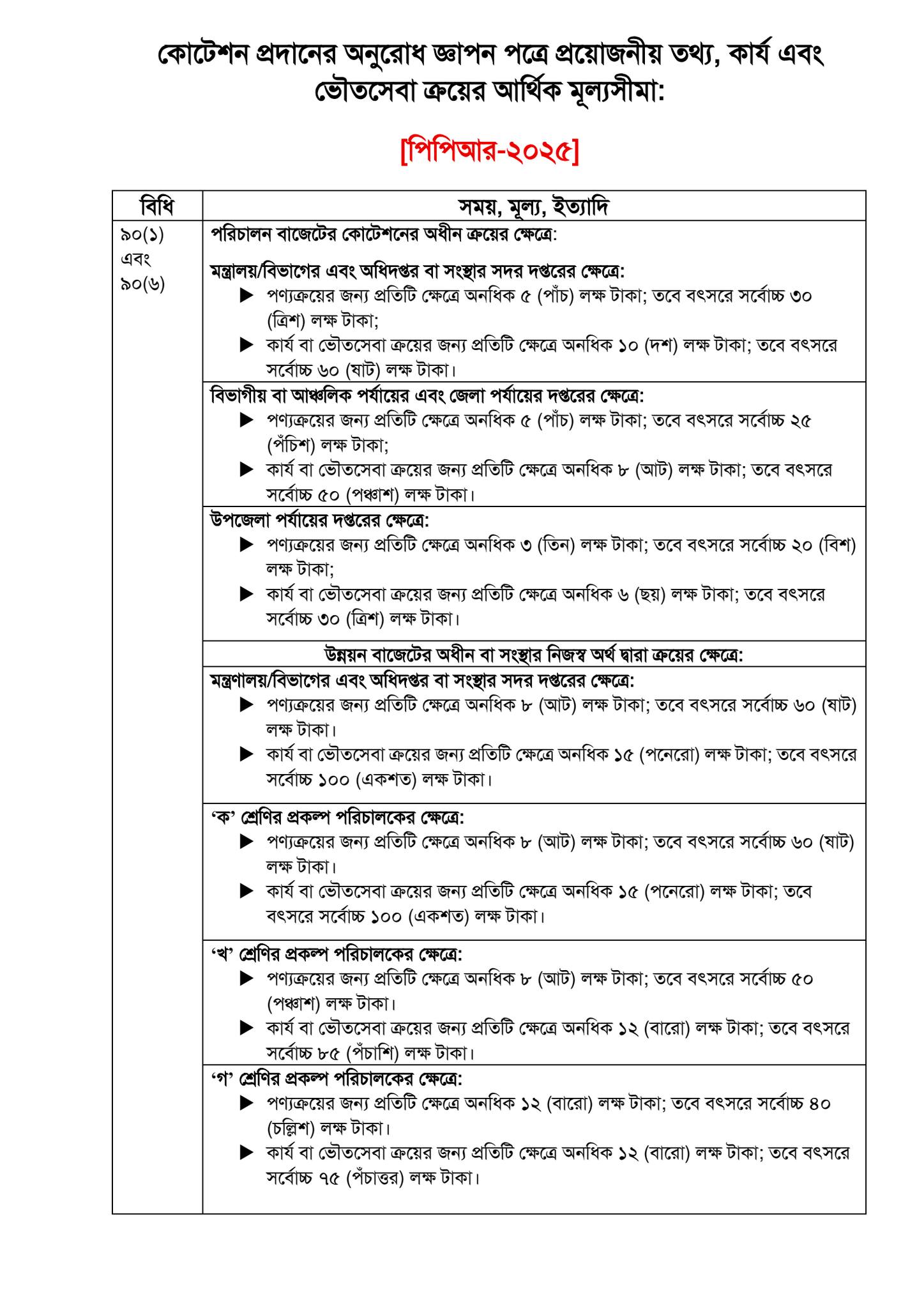 বিশেষ দ্রষ্টব্য: এখানে উল্লেখ করা সীমাগুলো একক কোটেশন আহ্বানের সর্বোচ্চ সীমা।