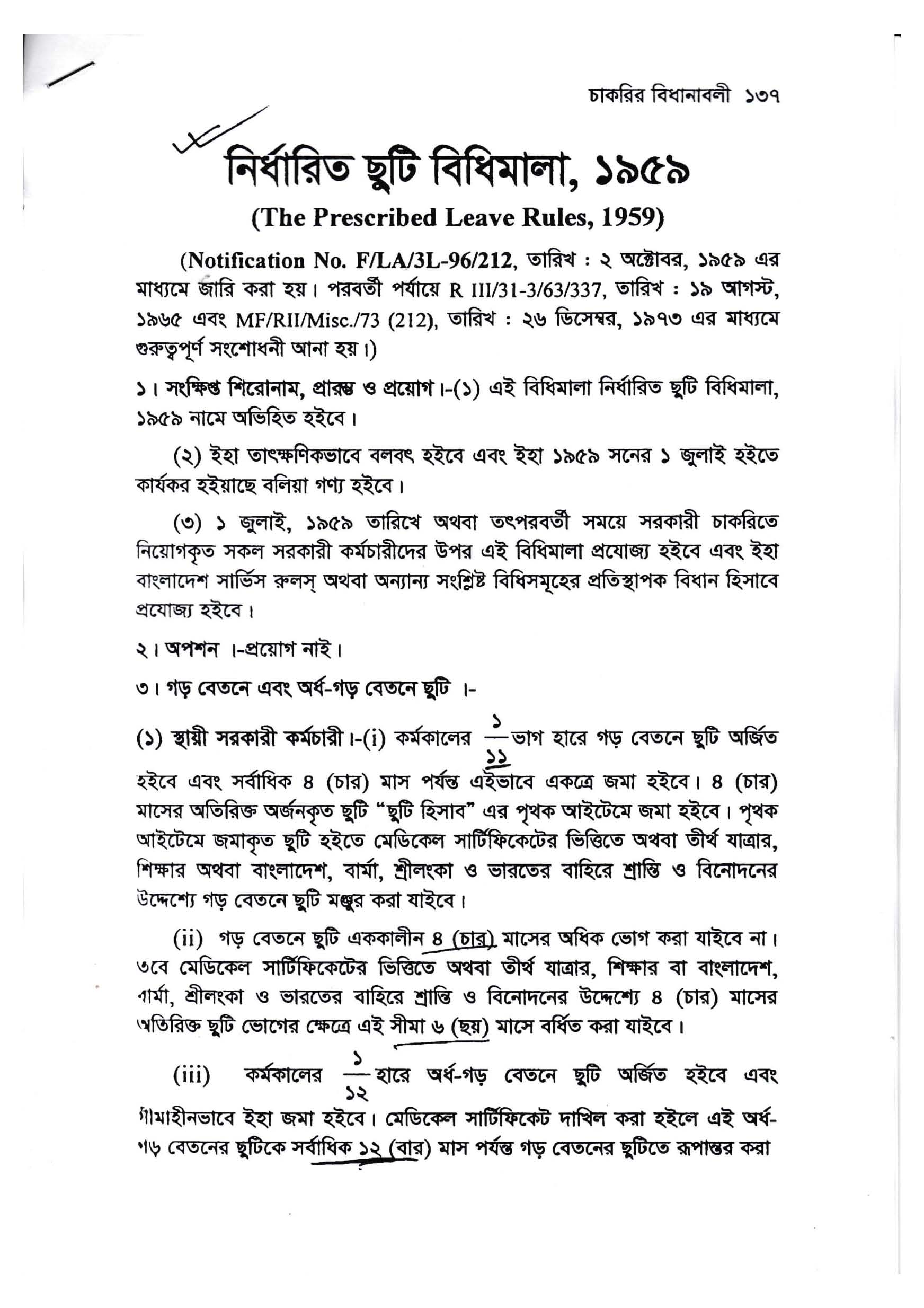The Prescribed Leave Rules, 1959, Notification No.F/LA/3L-96/212, তারিখ: ২ অক্টোবর, ১৯৫৯ এর মাধ্যমে জারি করা হয়। (নোটিফিকেশন নং (এফ,এ) ৩১- ৯৬/৫৯/২১২ তারিখ : ২রা অক্টোবর, ১৯৫৯-এর মাধ্যমে জারি করা হয় ) পরবর্তী পর্যায়ে নোটিফিকেশন নং আর-৩/৩১-৩//৬৩/৩৩৭ তারিখ : ১৯শে আগস্ট, ১৯৬৫-এর মাধ্যমে ৯নং বিধির ৩নং উপবিধির অনুচ্ছেদ ২-এর উপ-অনুচ্ছেদ (এ) তে এবং নোটিফিকেশন নং এম এফ/আর-২/মিস/৭৩ (২১২) তারিখঃ ২৬/১২/১৯৭৩-এর মাধ্যশে ৩নং বিধিতে গুরুত্বপূর্ণ সংশোধনী আনা হয় ।)