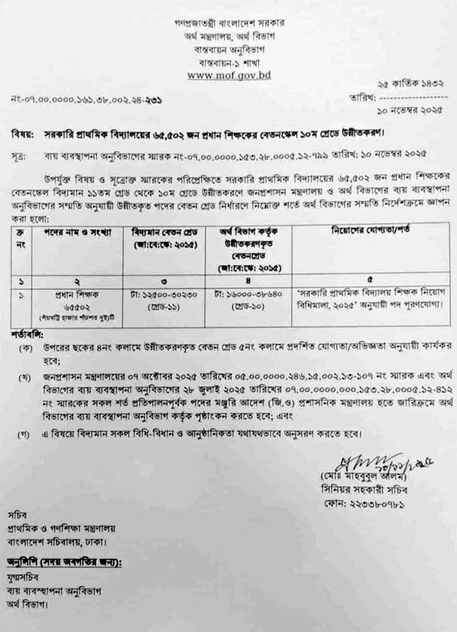 Primary Head Teacher 10th Grade 2025 । সরকারি প্রাথমিক বিদ্যালয়ের প্রধান শিক্ষকদের দশম গ্রেডে উন্নীতকরণে অর্থ বিভাগের সম্মতি?