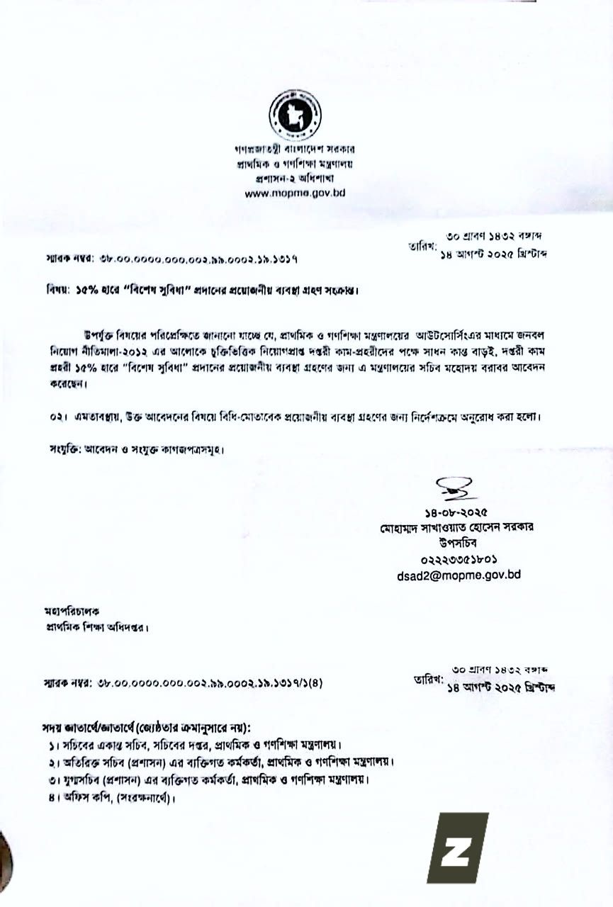 প্রাথমিক ও গণশিক্ষা মন্ত্রণালয়ের আউটসোর্সিংএর মাধ্যমে জনবল নিয়োগ নীতিমালা-২০১২ এর আলোকে চুক্তিভিত্তিক নিয়োগপ্রাপ্ত দপ্তরী কাম প্রহরীদের পক্ষে সাধন কান্ত বাড়ই, দপ্তরী কাম প্রহরী ১৫% হারে “বিশেষ সুবিধা” প্রদানের প্রয়োজনীয় ব্যবস্থা গ্রহণের জন্য এ মন্ত্রণালয়ের সচিব মহোদয় বরাবর আবেদন করেছে– চুক্তিভিত্তিক নিয়োগ প্রাপ্তদের বিশেষ সুবিধা ২০২৫
