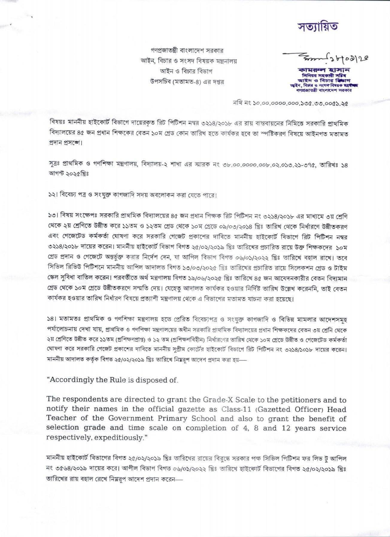 হাইকোর্ট বিভাগের ২৫/০২/২০১৯ তারিখের রায়ে প্রধান শিক্ষকদের ১০ম গ্রেড দেওয়া এবং সরকারি গেজেটে গেজেটেড কর্মকর্তা হিসেবে ঘোষণা করার নির্দেশ প্রদান করা হয়। এরপর আপিল বিভাগ ০৬/০১/২০২২ তারিখে এই রায় বহাল রাখে। যদিও পরে ১৩/০৩/২০২৫ তারিখে কিছু সুবিধা বাতিলের সিদ্ধান্ত নেওয়া হয়, ১০ম গ্রেড কার্যকরের তারিখে কোনো পরিবর্তন হয়নি।