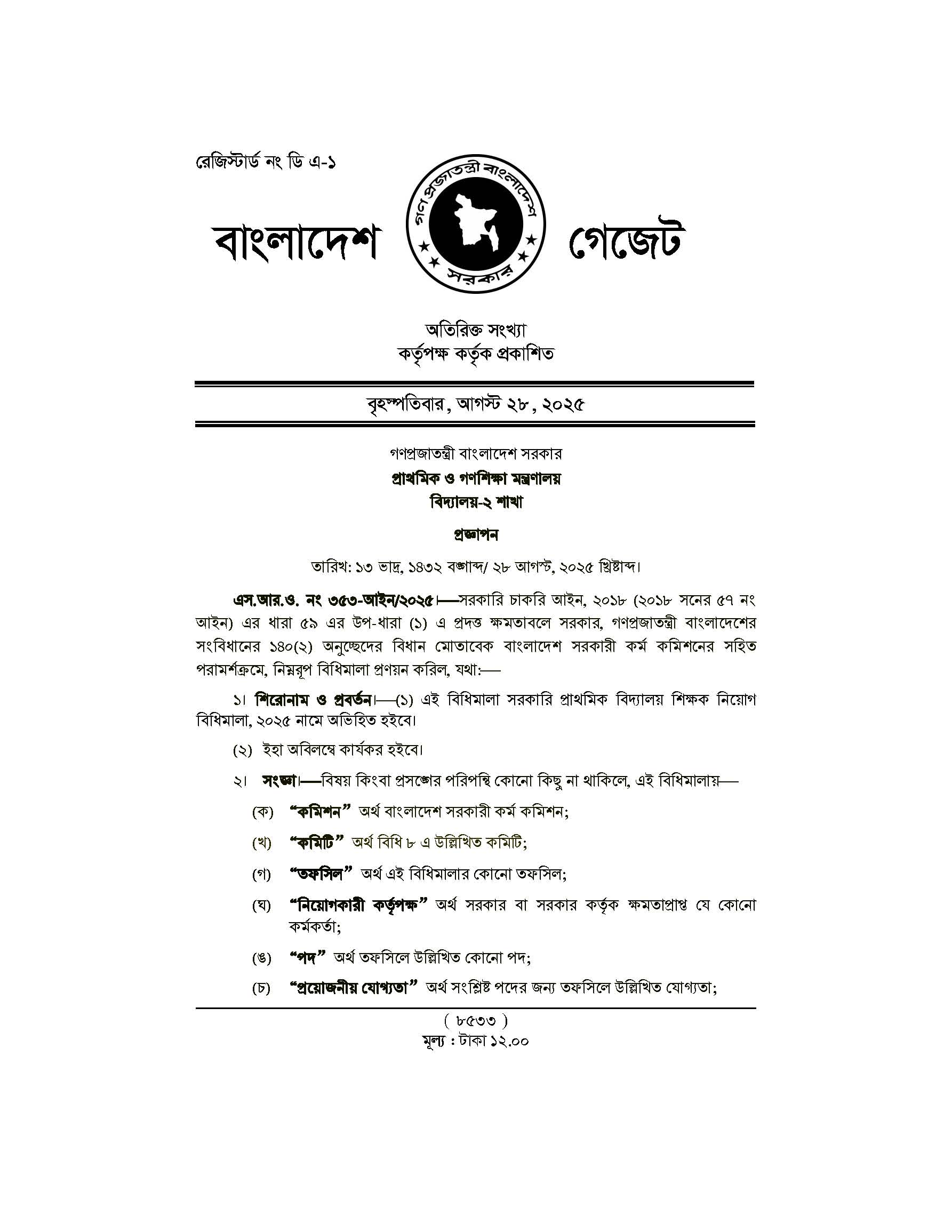 সরকারি প্রাথমিক বিদ্যালয় শিক্ষক নিয়োগ বিধিমালা-২০২৫ গেজেট
